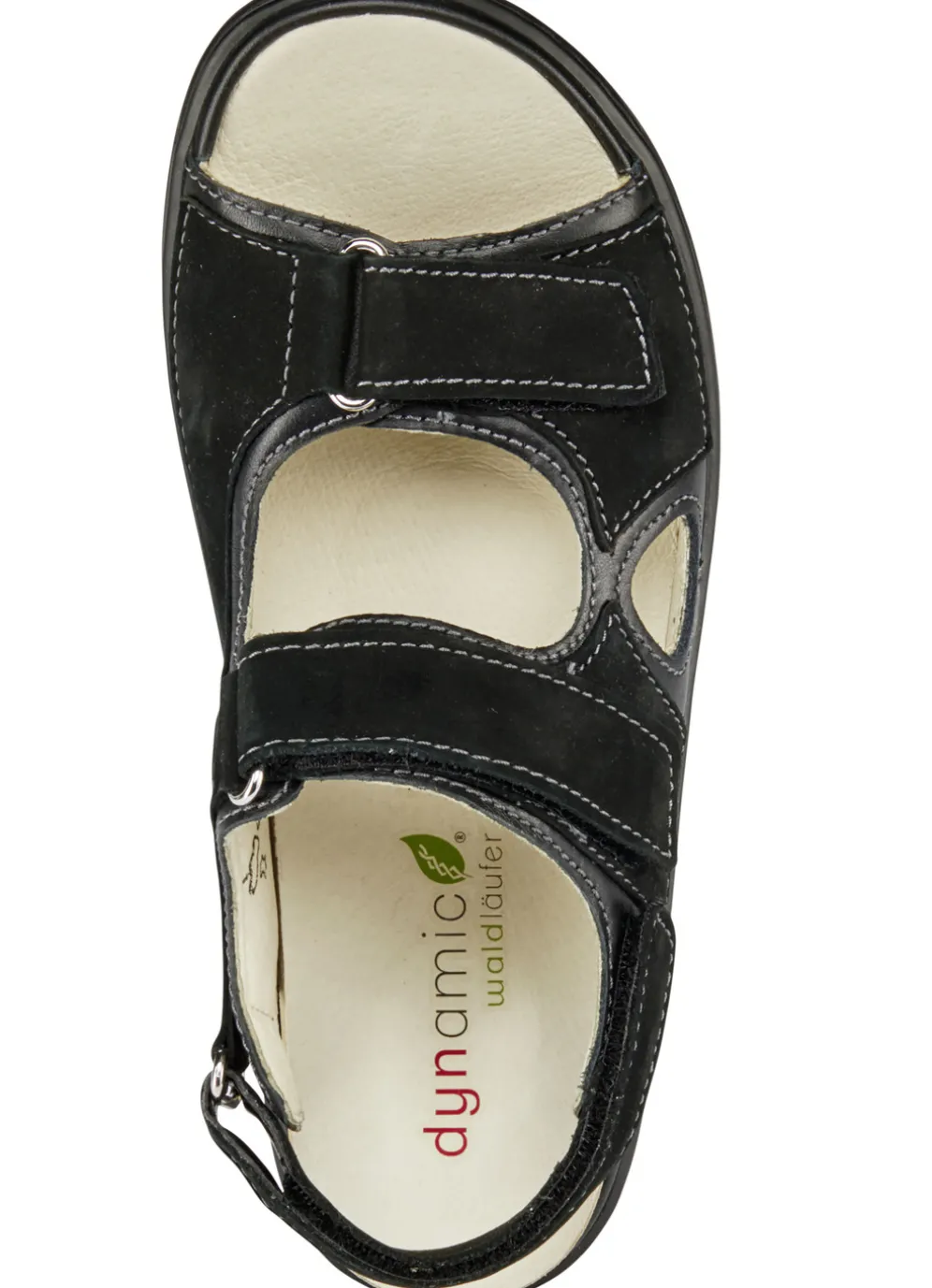 Sandalen aus genarbtem Rind-Nappaleder, in Schwarz mit Rind-Nubukleder kombiniert: Weite H, drei verstellbare Klettspangen, Lederfutter, herausnehmbares Lederfußbett, PU-Luftpolster-Profilsohle mit Abrollfunktion und breiter Auftrittsfläche, daher Gelenk unterstützend. 30 mm Keilabsatz