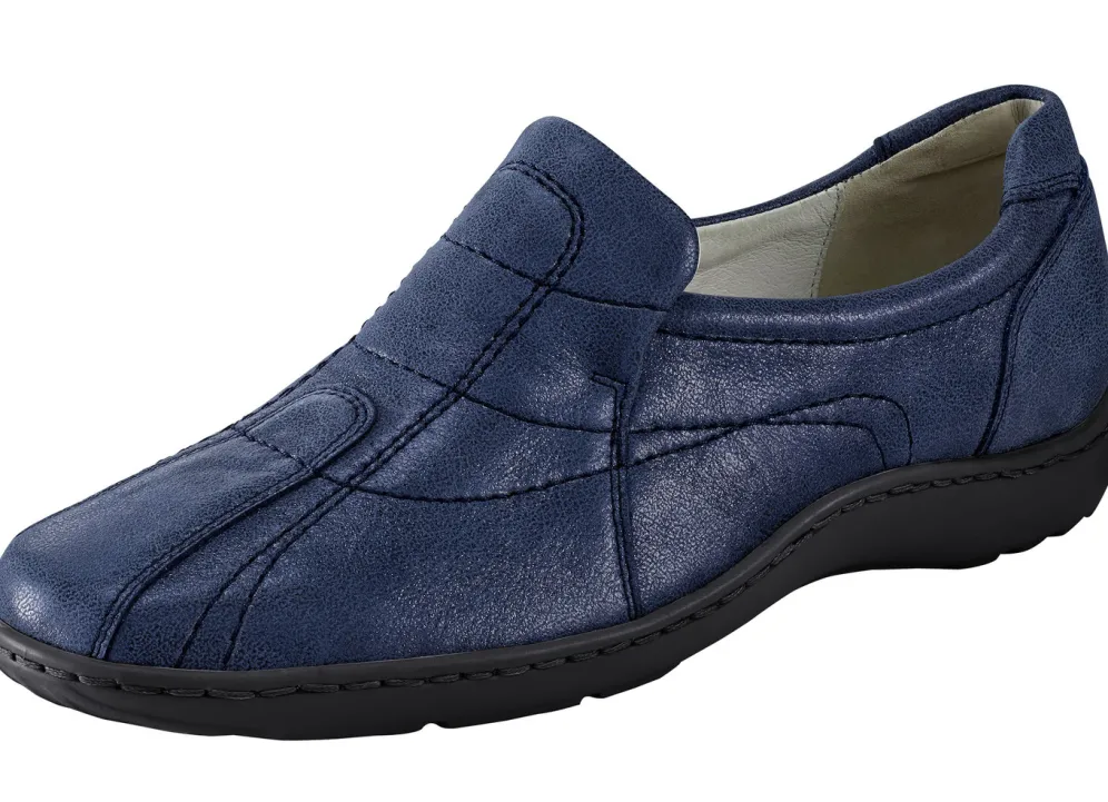 Waldläufer, bequeme Damen-Slipper, Weite H, mit herausnehmbarem Fußbett in Schuhgröße 7 und in Stahlblau.