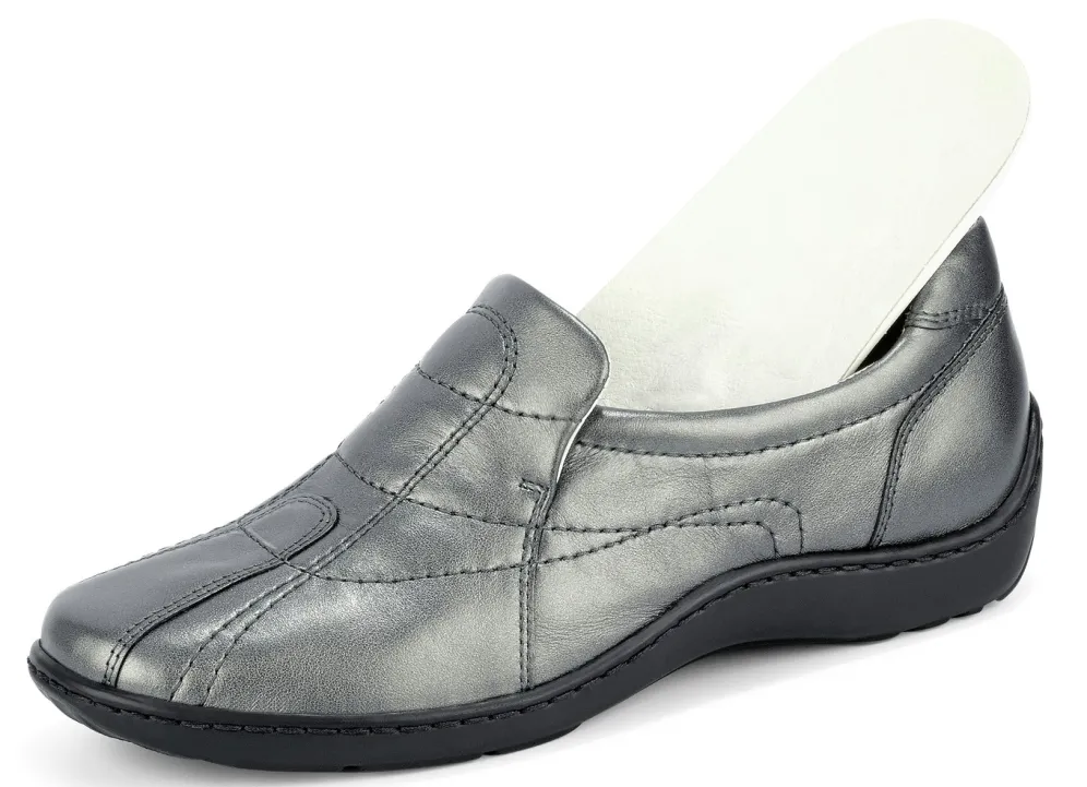 Slipper aus Rindleder mit edlem Metallic-Schimmer: in Weite H, verdeckter Gummizug, ledergefüttertes Quartier, herausnehmbares Leder-Massagefußbett, leichte PU-Handnaht-Profilsohle sowie 20 mm Keilabsatz