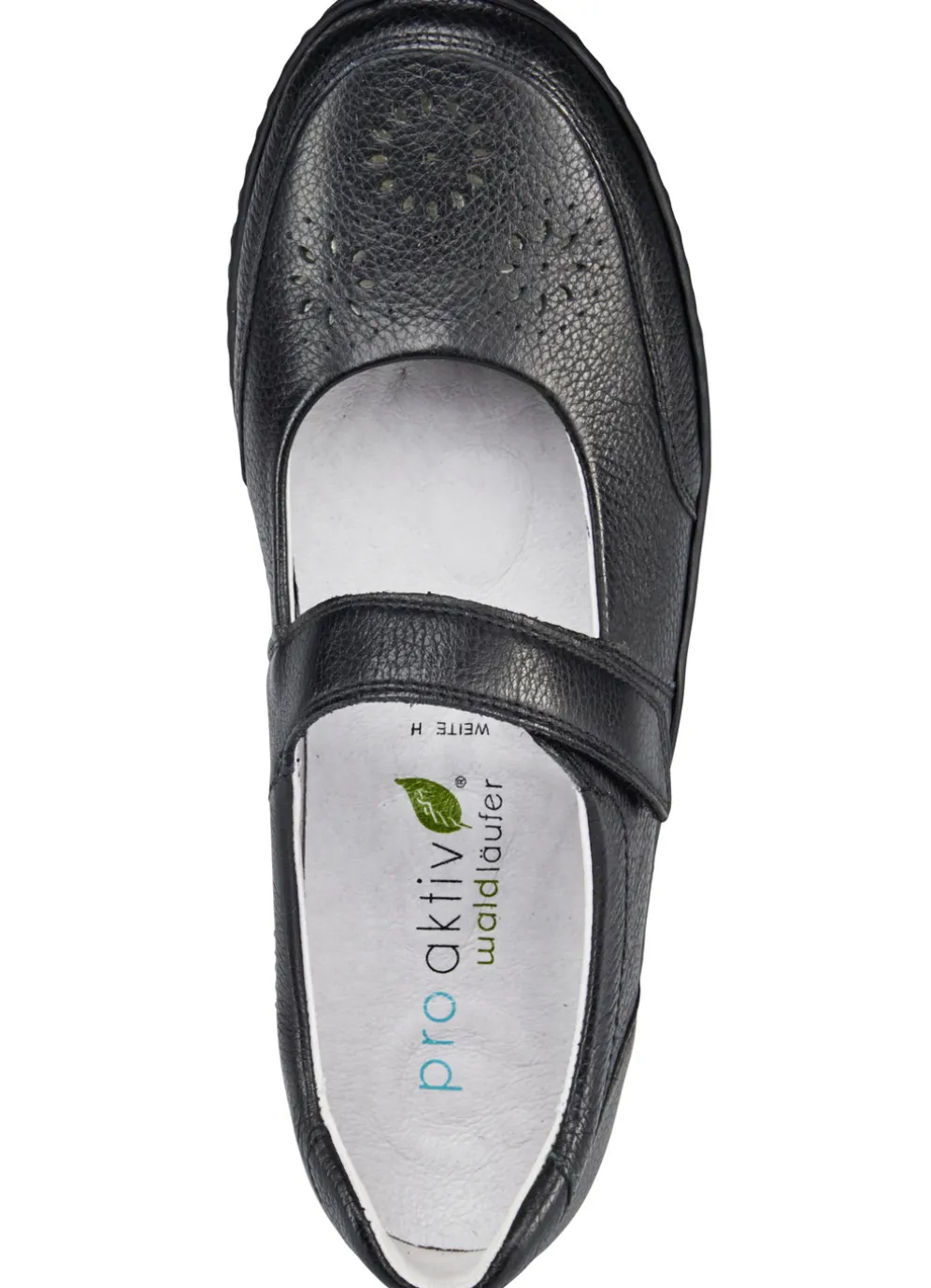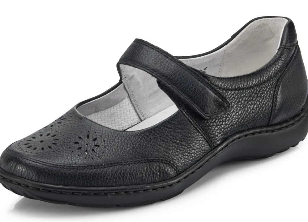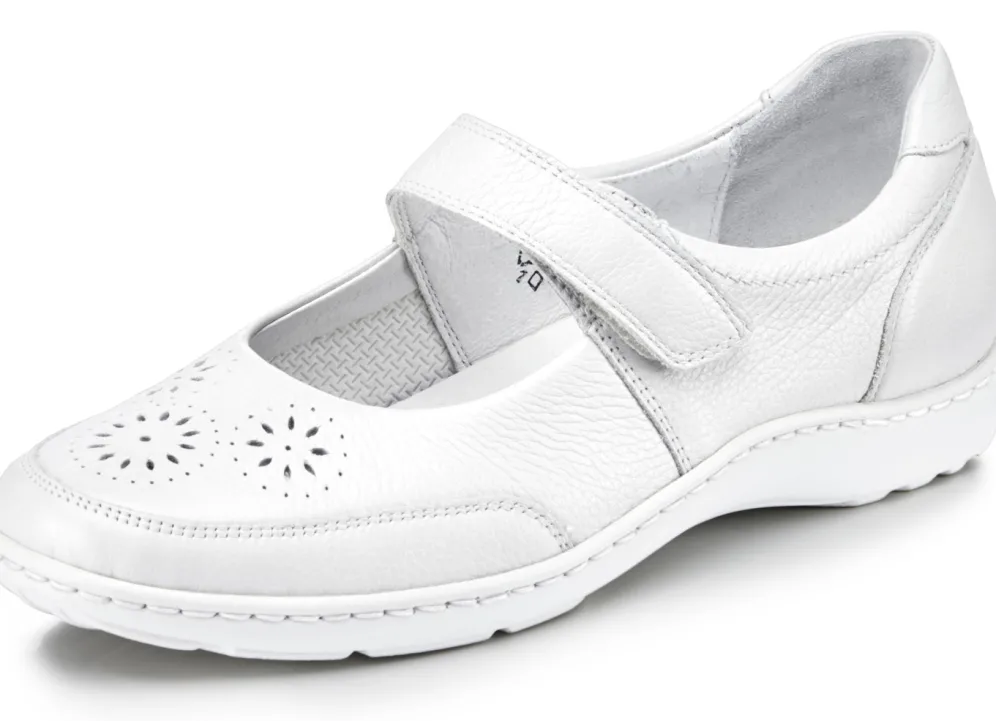 Slipper aus Rind-Nappaleder: Weite H, luftige Perforation, verstellbare Klettspange, ledergefüttertes Quartier, herausnehmbares Leder-Massagefußbett, leichte PU-Handnaht-Profilsohle sowie 20 mm Keilabsatz