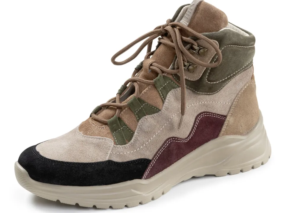 Stiefeletten in Taupe-Multicolor aus hochwertigem Veloursleder mit Schnürung und gepolstertem Schaftrand: Weite H, ledergefüttertes Quartier, herausnehmbares Lederfußbett, superleichte EVA-Laufsohle sowie 20 mm Keilabsatz. Schafthöhe ca. 11 cm