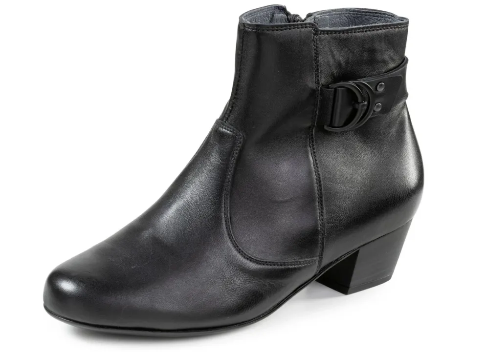 Schwarze Stiefeletten aus weichem Nappaleder, mit Zierspange: Weite K, Innenreißverschluss, Lederfutter, herausnehmbares Lederfußbett, leichte TPU-Riffelsohle sowie 35 mm Absatz. Schafthöhe ca. 13 cm