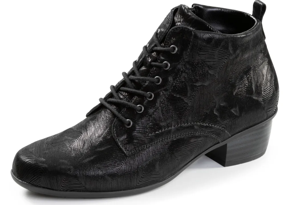 Schwarze Stiefeletten aus hochwertigem Veloursleder mit zart schimmernder Prägung: Weite H, Schnürung, praktischer Innenreißverschluss, wärmendes Textilfutter, herausnehmbares Filz-Fußbett, leichte TPU-Luftpolster-Profilsohle sowie 35 mm Absatz. Schafthöhe ca. 10 cm