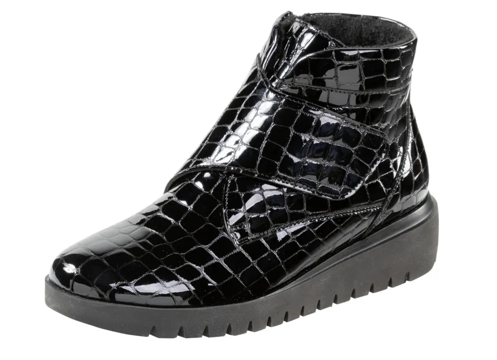 Schwarzer Bootie aus krokogeprägtem Lackleder, mit verstellbarer Klettspange: Weite H, Innenreißverschluss, wärmendes Textilfutter, herausnehmbares Filz-Fußbett, leichte EVA-Profilsohle sowie 20 mm Keilabsatz. Schafthöhe ca. 11 cm
