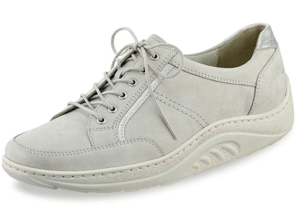 Waldläufer Schnürschuh mit edlen Metallicleder-Einsätzen in Schuhgröße 3 1/2 und in Pastellgrau.
