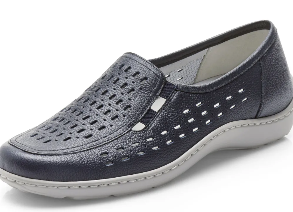Slipper aus luftig perforiertem Nappaleder, mit seitlich eingesetzten Gummizügen: in Weite H, Textilfutter, herausnehmbares Leder-Massagefußbett, leichte PU-Handnaht-Profilsohle sowie 20 mm Keilabsatz
