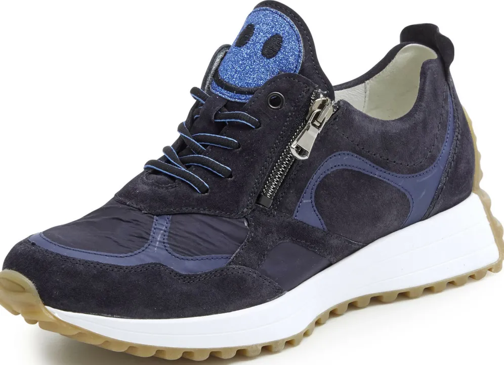 Sneaker aus Veloursleder und feinem Textilmaterial, mit frecher Glitzer-Applikation auf der Zunge: in Weite H, Schnürung und Reißverschluss, ledergefüttertes Quartier, herausnehmbares Lederfußbett, TR-Luftpolster-Profilsohle sowie 30 mm Keilabsatz