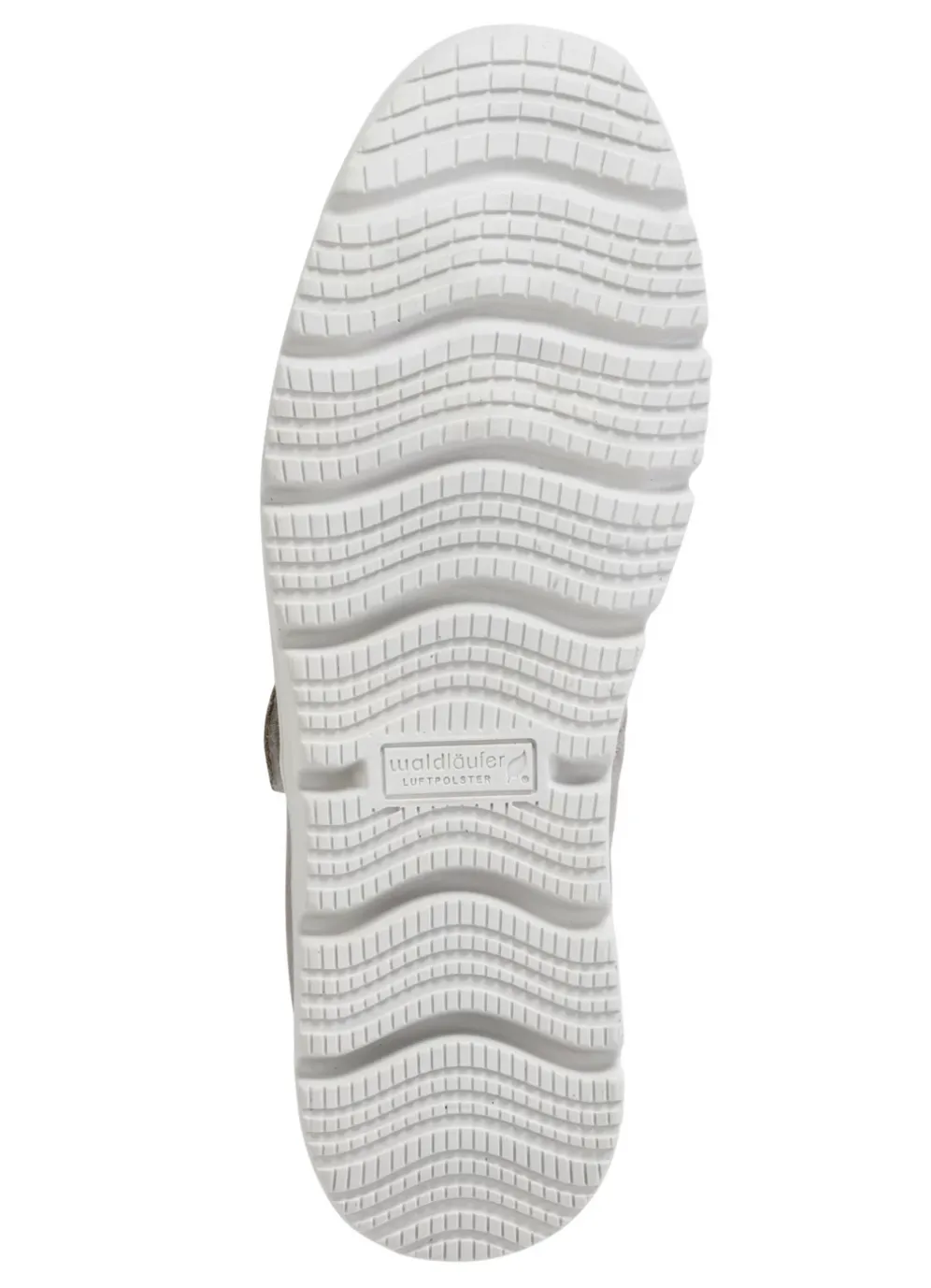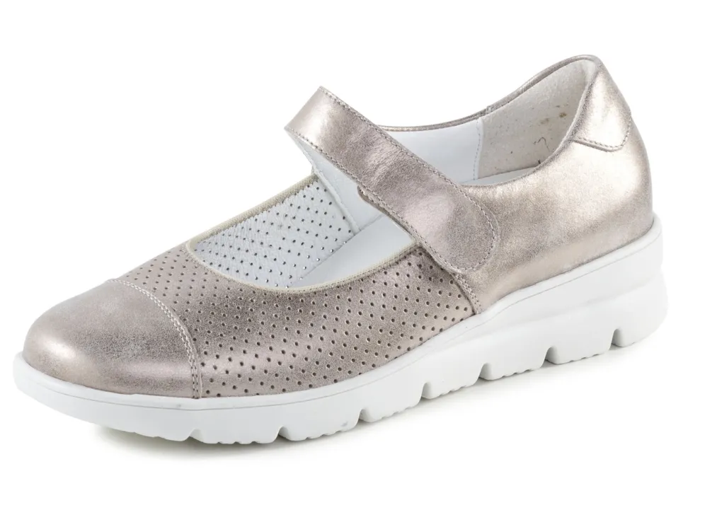 Hochwertiger Spangenschuh aus teilweise gelochtem Nappa- oder Nubukleder: Weite H, Klettverschluss, Lederfutter, herausnehmbares Lederfußbett, leichte Synthetik-Luftpolster-Profilsohle sowie 20 mm Keilabsatz