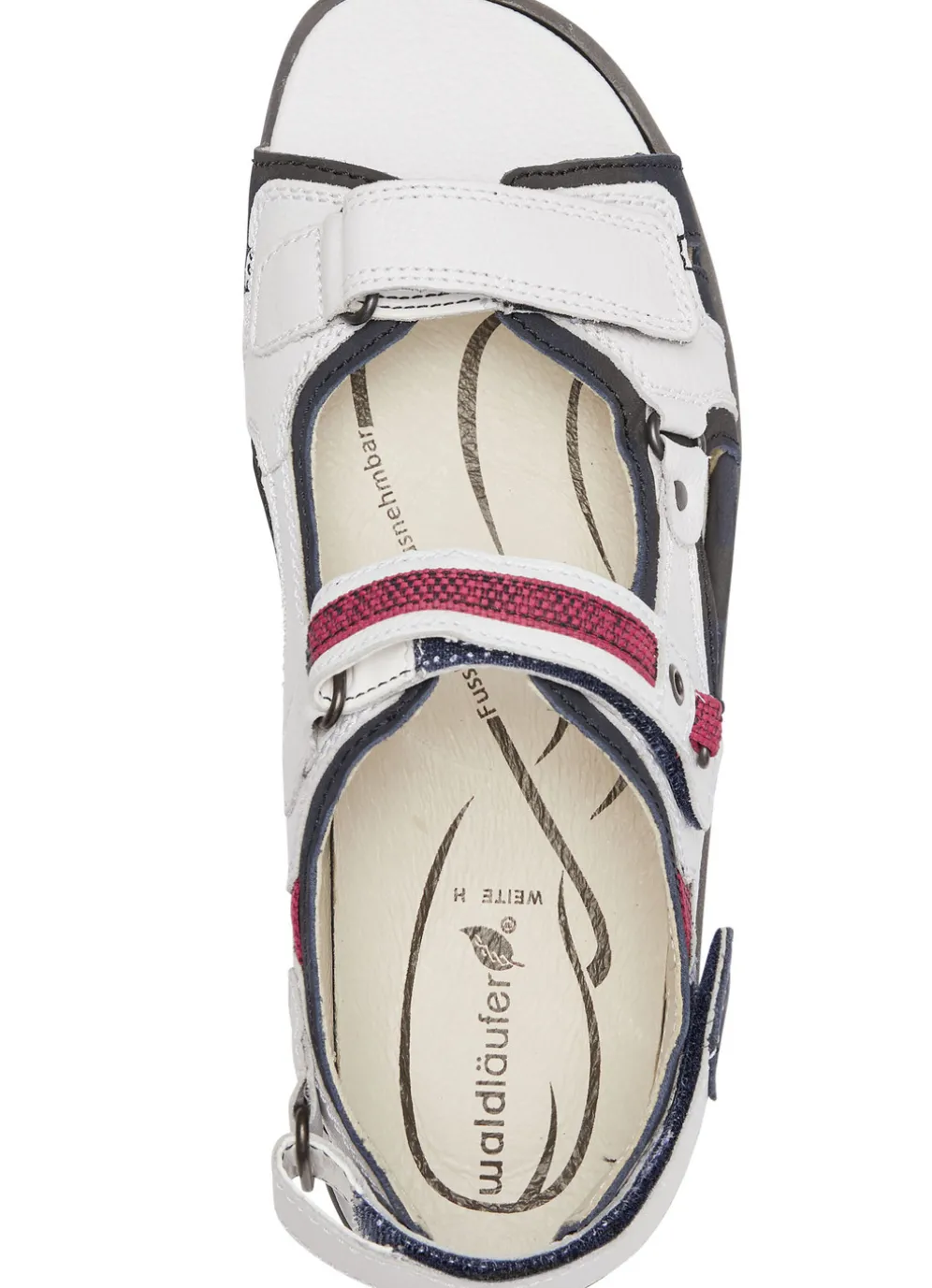 Sandalen aus Rind-Nubuk- oder Nappaleder, mit Textilbesätzen: Weite H, drei Klettspangen, Lederfutter, herausnehmbares Lederfußbett mit Fersenpolster, TR-Profilsohle, 20 mm Keilabsatz