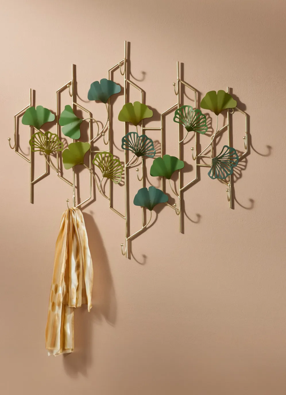 Diese hübsche Wanddekoration wird garantiert zum echten Hingucker an Ihren Wänden! Sie zeigt verschiedene Ginkgo-Blätter die in unterschiedlichen Farben lackiert wurden. Dank der 12 Haken, kann sie auch optimal als Wandgarderobe genutzt werden. Aus Metall gefertigt. Maße: B79,5xH71xT5,6 cm