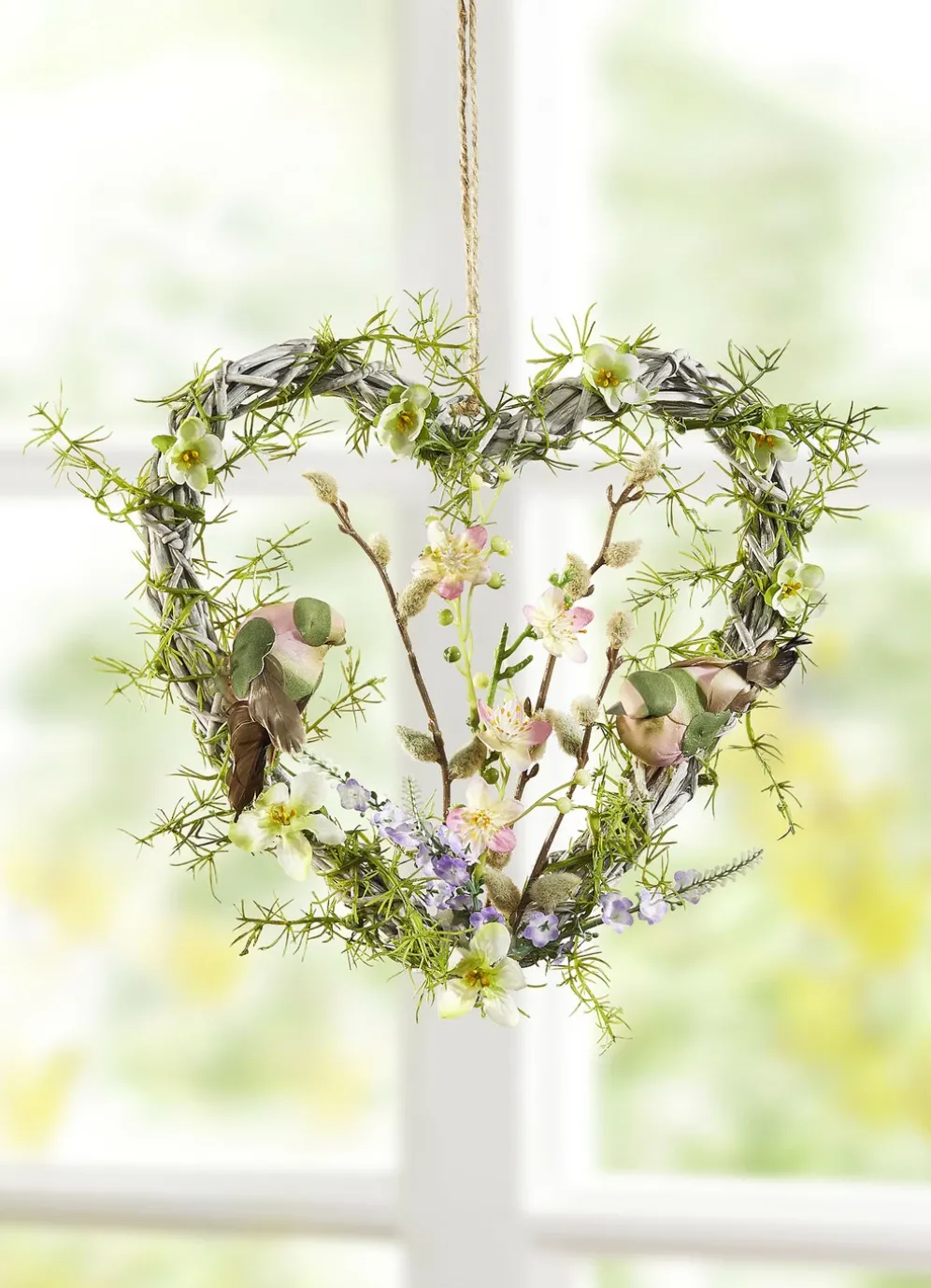In einer frühlingshaften Farbkombination präsentiert sich dieses tolle Wandherz! Geschmückt mit Blümchen, Weidenkätzchen und zwei Vögeln aus Styropor. Mit Aufhängung. Aus Kunst- und Textilmaterial gefertigt.