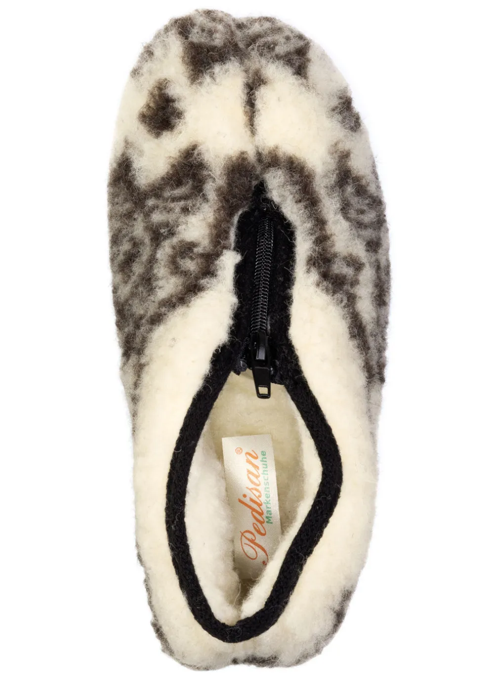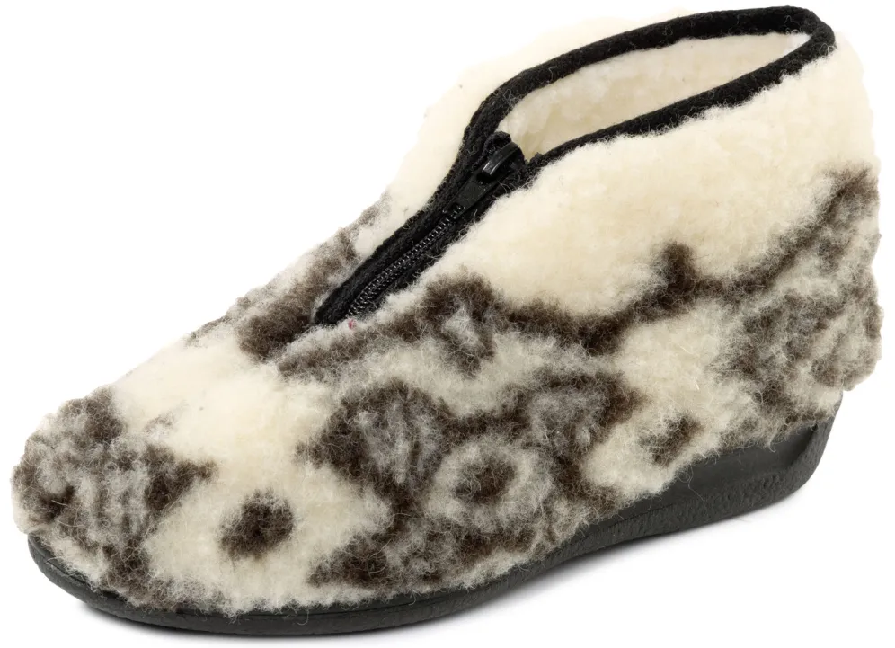 Kuschelige Hausschuhe in Ecru-Braun aus bedrucktem Wollplüsch mit Reißverschluss: Warmfutter und Fußbettbezug aus 100% Schurwolle, leichte Synthetik-Riffelsohle sowie 20 mm Keilabsatz