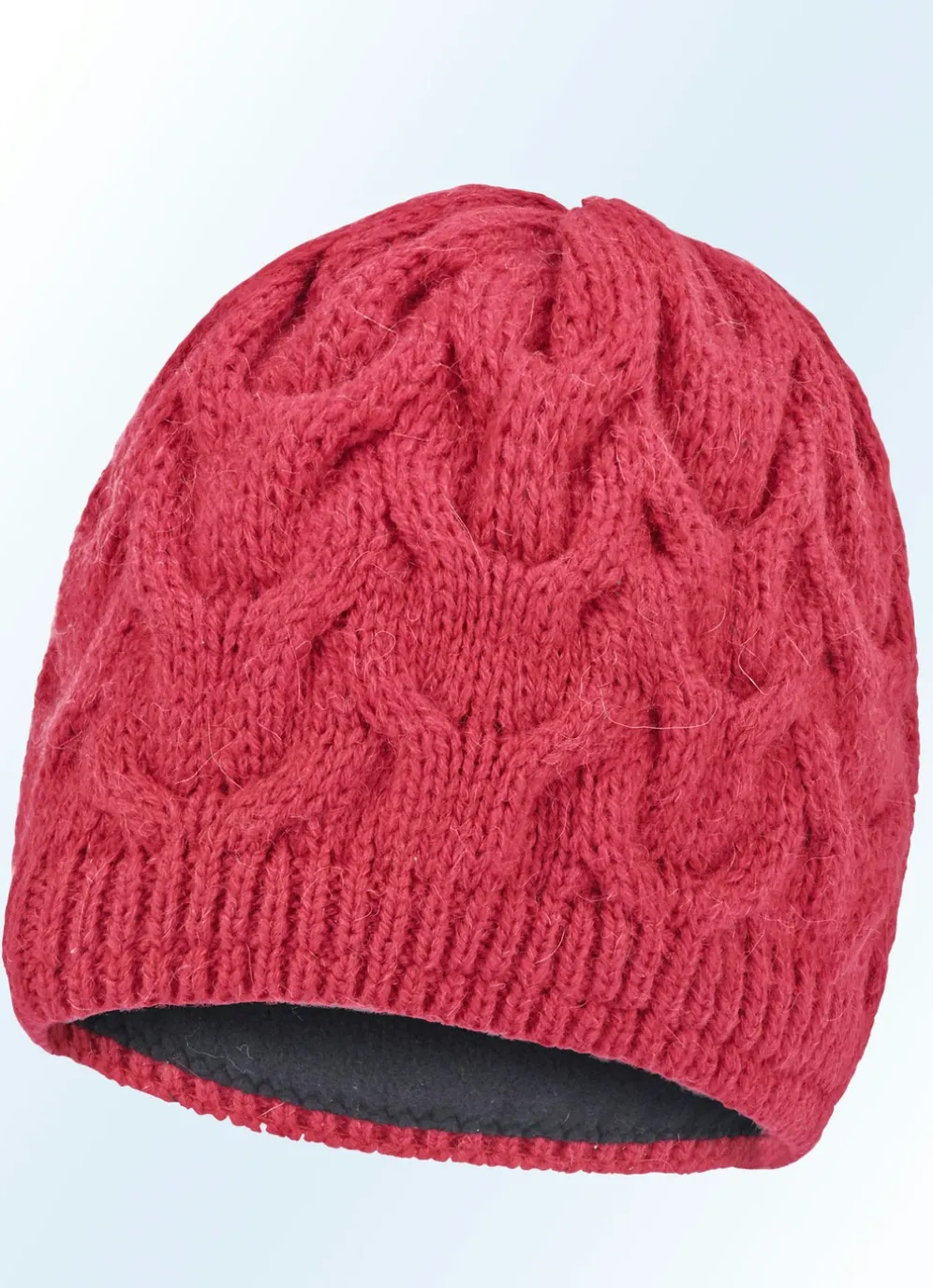 Warme Damen-Mütze aus Grobstrick mit angesagtem Zopfmuster. Qualität: 75% Polyacryl, 15% Wolle, 10% Alpaka, 20% Alpaka, Fleece-Teilfutter aus 80% Baumwolle und 20% Polyester. In Universalgröße