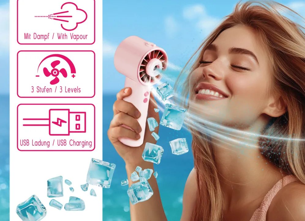 Perfekt für unterwegs oder zuhause: Der stylische, tragbare Lady Air Cooler mit seinem kleinen Wassertank und den 3 Geschwindigkeitsstufen liefert Ihnen sofortige Abkühlung. Dank seines geringen Gewichts und kompakten Designs passt er in jede Handtasche und sorgt überall für eine erfrischende Brise. Stilvoll, handlich und praktisch – Ihr idealer Begleiter für heiße Tage! Nano Zerstäuberfunktion: der feine Sprühnebel sorgt für gleichmäßige Verteilung und angenehme Erfrischung auf der Haut – ohne lästiges Beschlagen von Brillengläser! Inkl. Ladekabel Typ USB-C und Nachfüllampulle. Maße: H16,9xB6,5xT6,2 cm.
