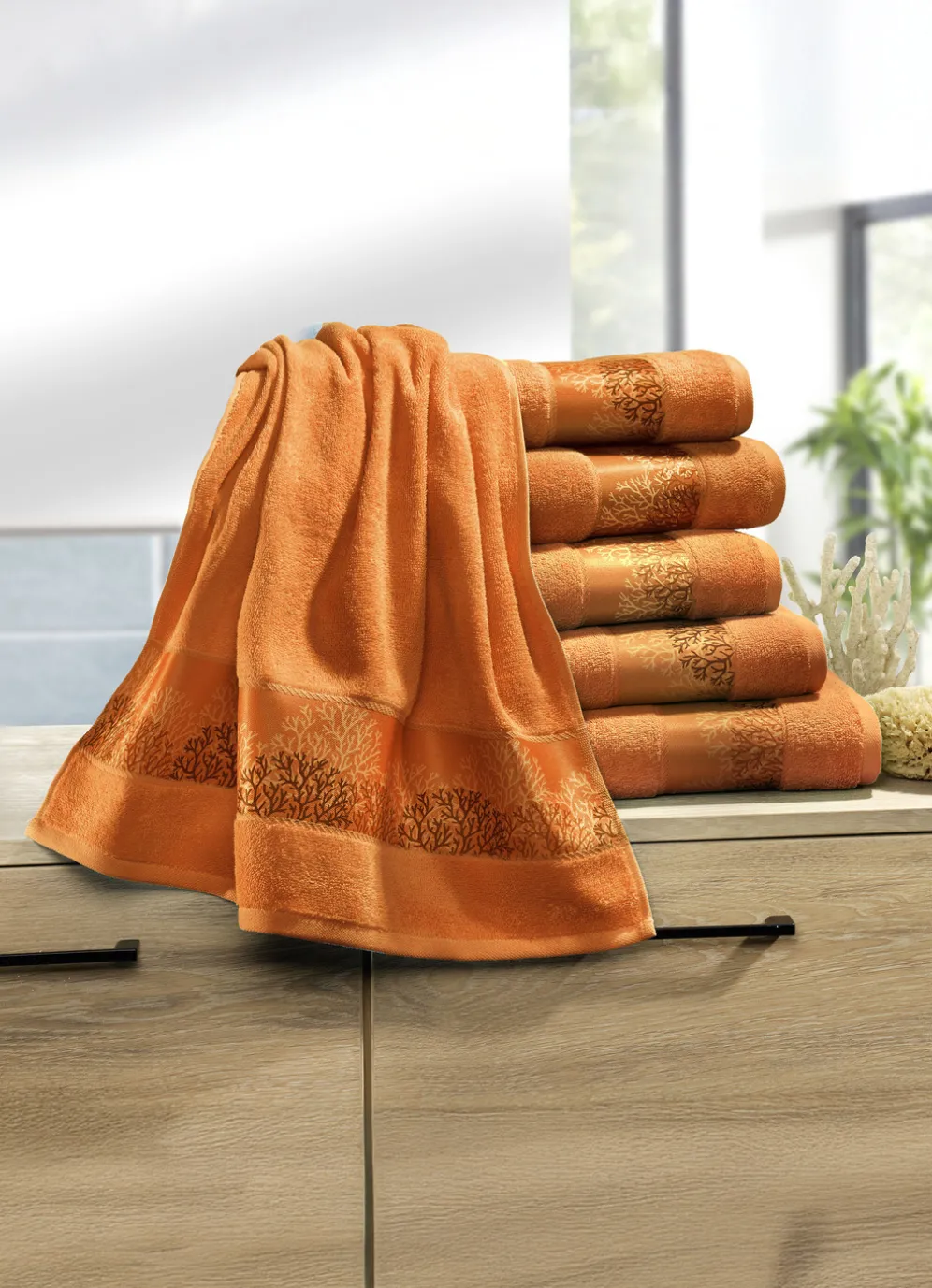 Weiche Frottier-Serie mit hochwertiger Jacquard-Bordüre in Größe 202 (2 Gästehandtücher, 30/ 50 cm) und in Terra.