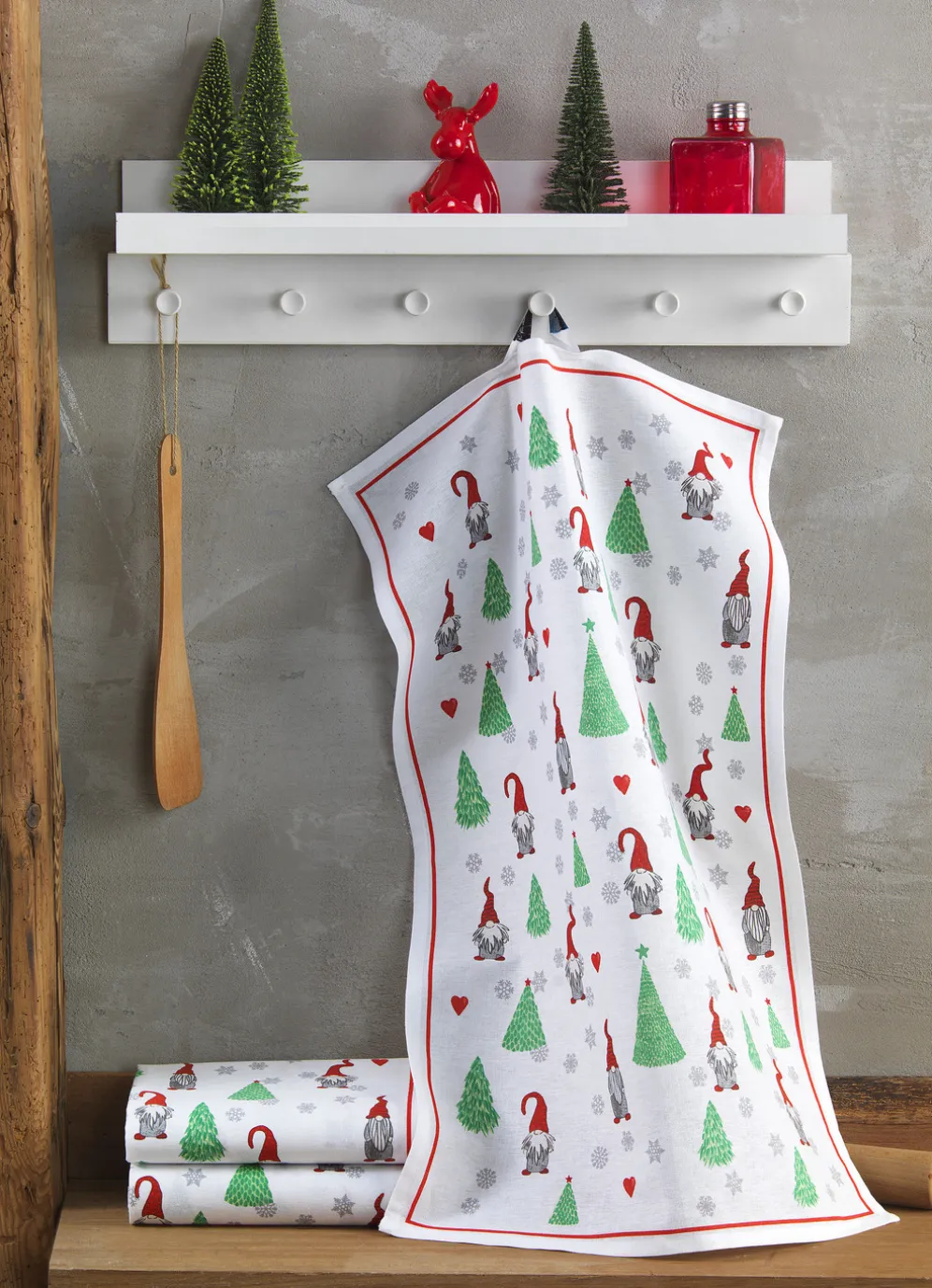 Niedliche Weihnachtswichtel, Tannenbäume, Schneeflocken und kleine Herzchen auf diesen Geschirrtüchern bringen ein weihnachtliches Ambiente in Ihre Küche. Die Qualität: 100% Baumwolle. Waschbar bis 60 °C. Maße: je 45/70 cm