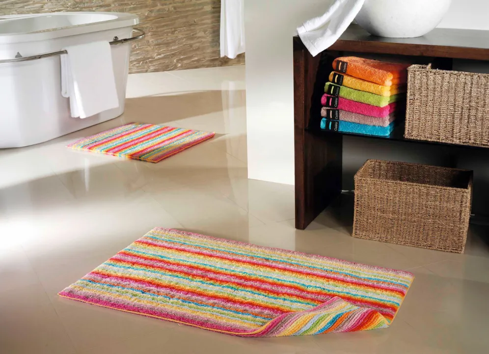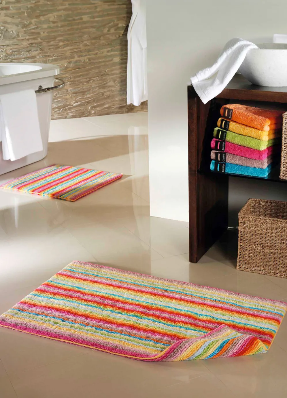 Wende-Badteppich. Hochwertig getuftet, aus 100% Baumwolle (gekämmt). Waschbar bis 60 °C, für Trockner und Fußbodenheizung geeignet.