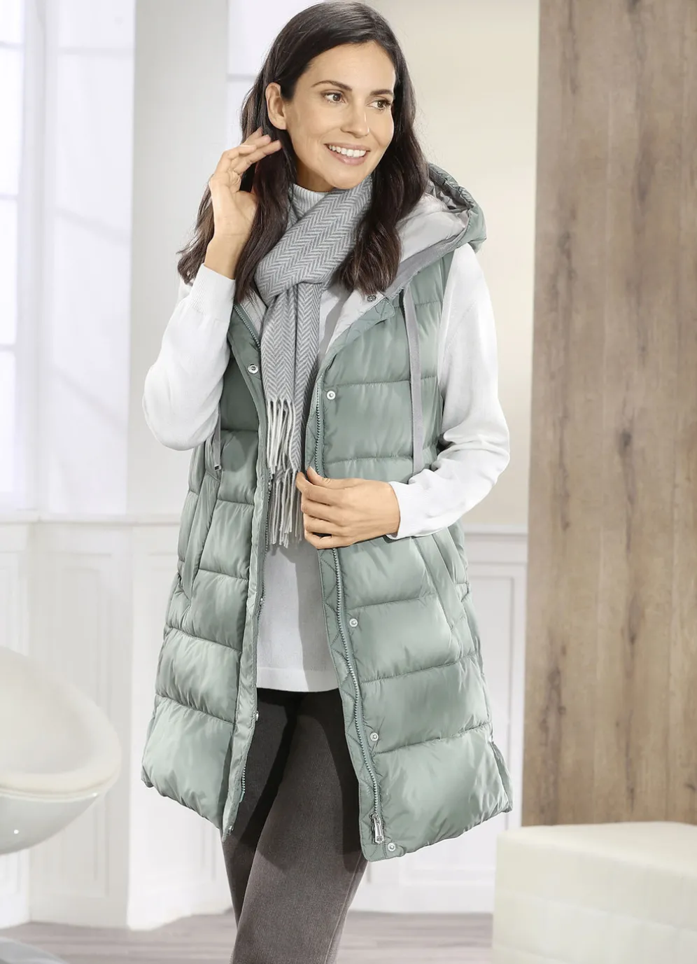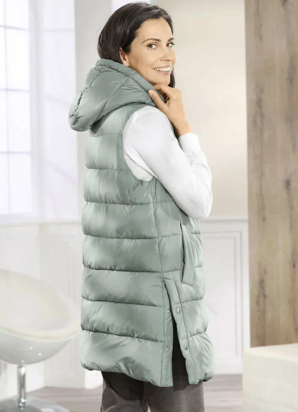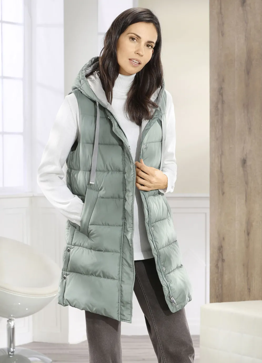 Resedagrüne Weste: feste Kapuze mit Bindeband, 2-Wege-Reißverschluss unter der verdeckten Druckerleiste, Schubtaschen mit breiter Blende, Seitenschlitze mit Druckern sowie eine Innentasche. Länge ca. 82 cm, ab Gr. 44 ca. 83 cm, bei Gr. 52 ca. 84 cm.