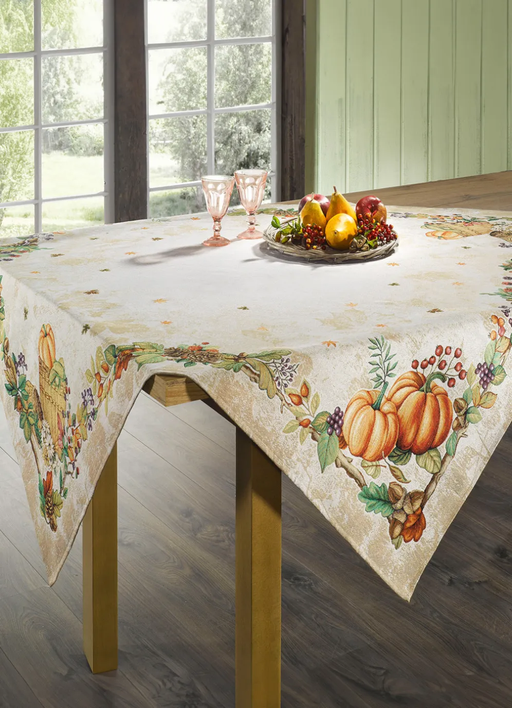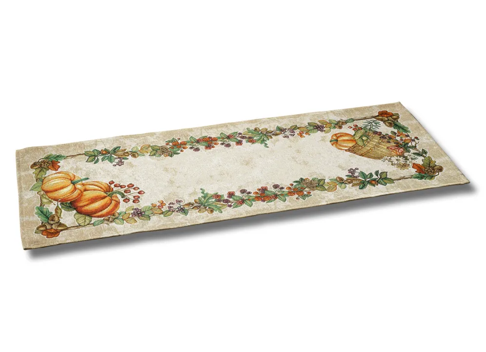 Ein herbstliches Arrangement aus Kürbissen und buntem Blattwerk ziert diese detailreich dessinierten Accessoires. Kissenbezug mit Reißverschluss. Qualität: Gobelin aus 60% Polyester und 40% Baumwolle. Waschbar bis 30 °C.