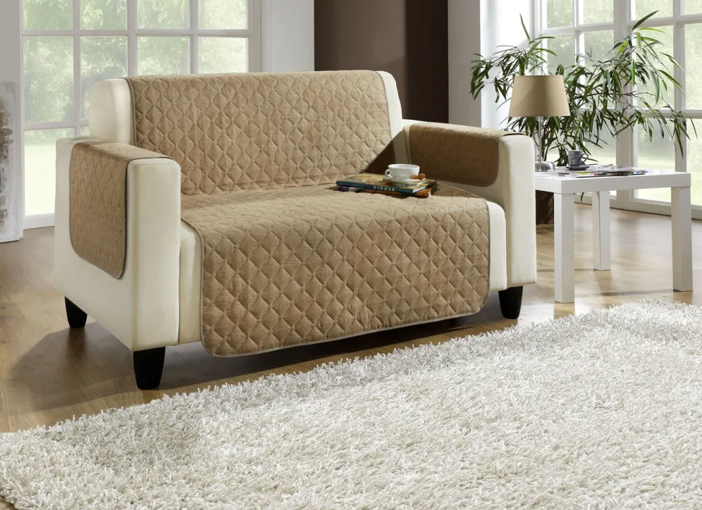 Wohnaccessoires mit Anti-Rutsch-Beschichtung in Größe 103 (Couchschoner, 100×200 cm) und in Sand.