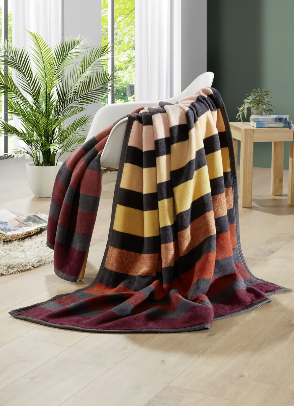 Wohndecke mit Veloursbandeinfassung in Rot-Braun Gestreift.