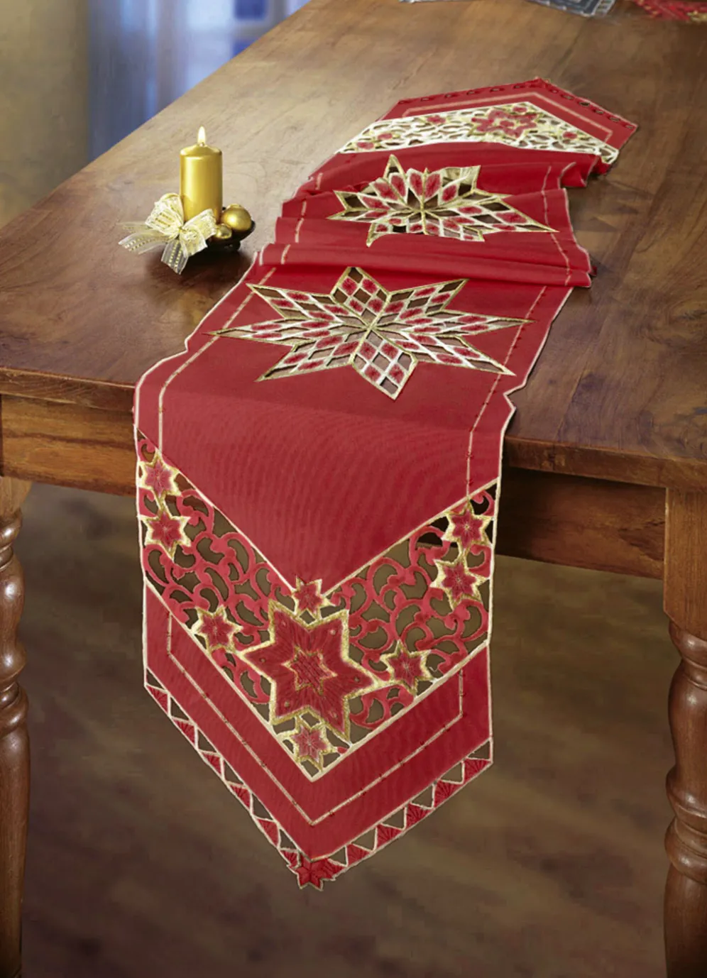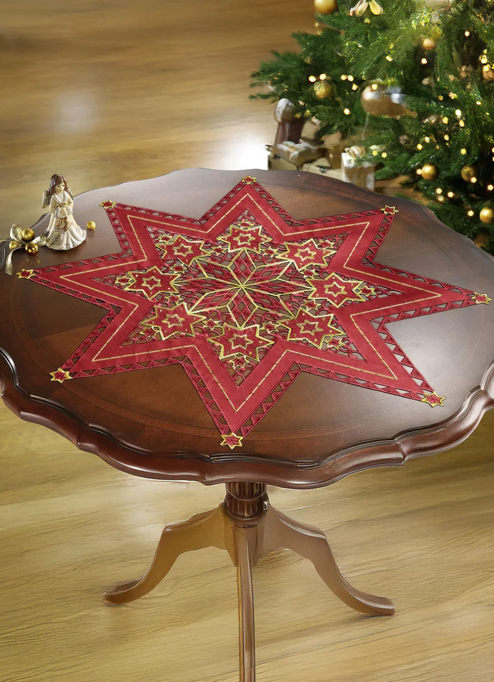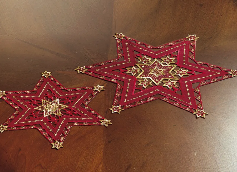 Wunderhübsch bestickte Tischdekoration in Größe 130 (Stern, 2er-Set, ø 30 cm) und in Rot.