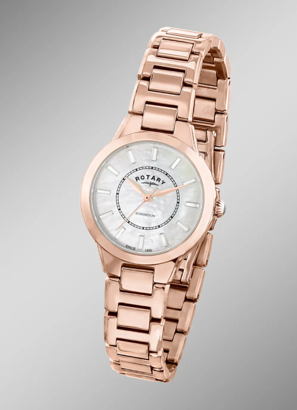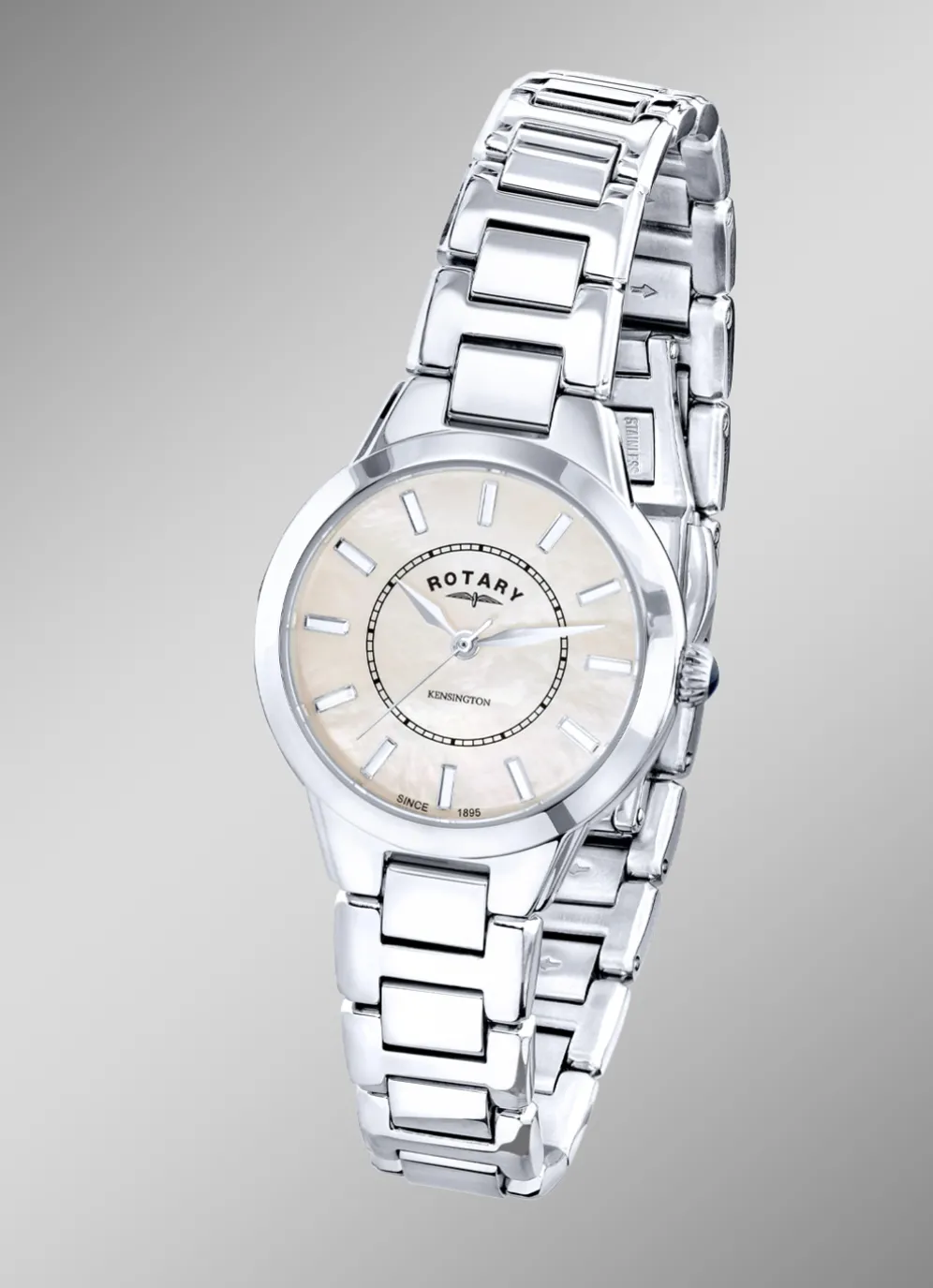 Wunderschöne Damenuhren aus der Serie Kensington der Marke „Rotary“. Die Damenuhren haben ein Edelstahlbandgehäuse und Saphirglas. Die Uhren haben ein Zifferblatt mit Perlmutt-Einlage und weißen Swarovski-Kristallen. Die Uhren gibt es wahlweise in Weiß oder Rot. Sie sind 5 bar wasserdicht und haben einen Gehäusedurchmesser von 28mm.