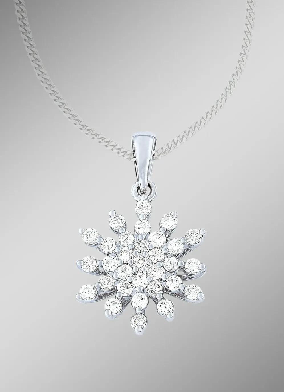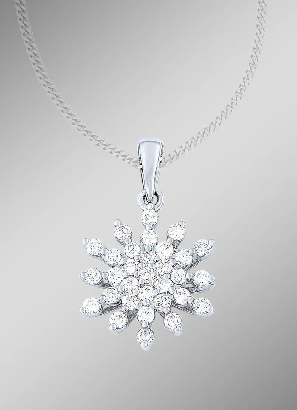 Dieser wundervolle Anhänger überzeugt durch seine besondere Schneeflocken-Form. Erfreuen Sie sich jeden Tag an dem mit 31 Brillanten, zusammen ca. 0,50 ct., Weiß, Piqué 2, besetzten Schmuckstück aus Weißgold 585/- fein. Der Durchmesser beträgt 12 mm. Das perfekte Schmuckstück für jeden Anlass