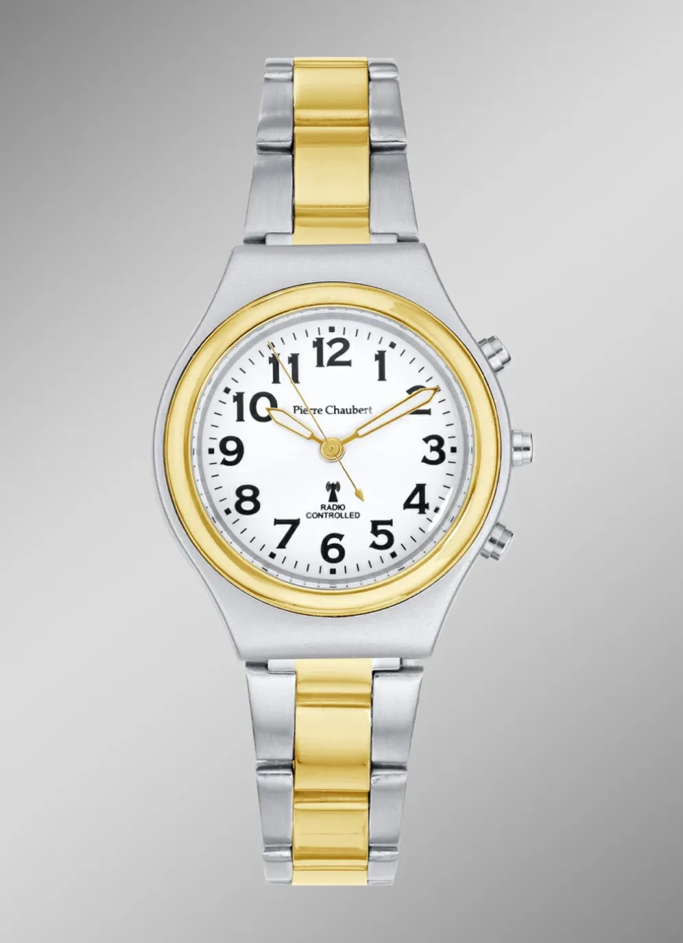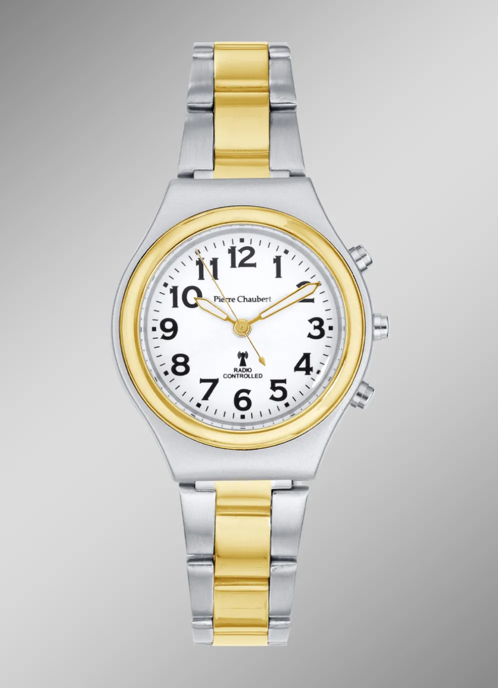 Zeitlose Funk-Damenuhr der Marke Pierre Chaubert mit einem Uhrenband aus Edelstahl, bicolor.