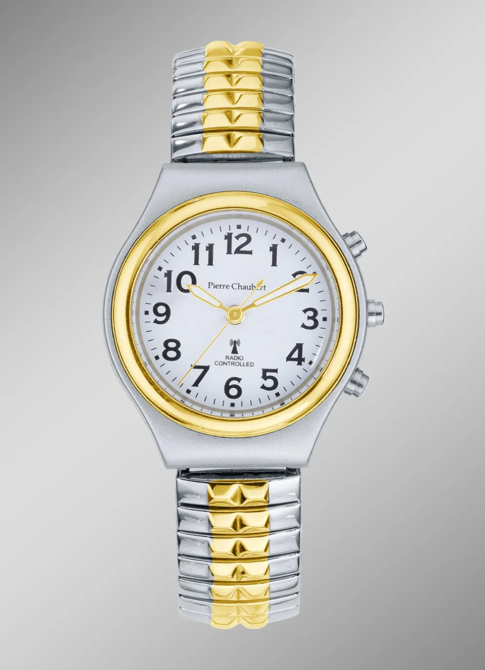 Zeitlose Funk-Damenuhr der Marke Pierre Chaubert mit einem Uhrenband aus Zugband, bicolor.