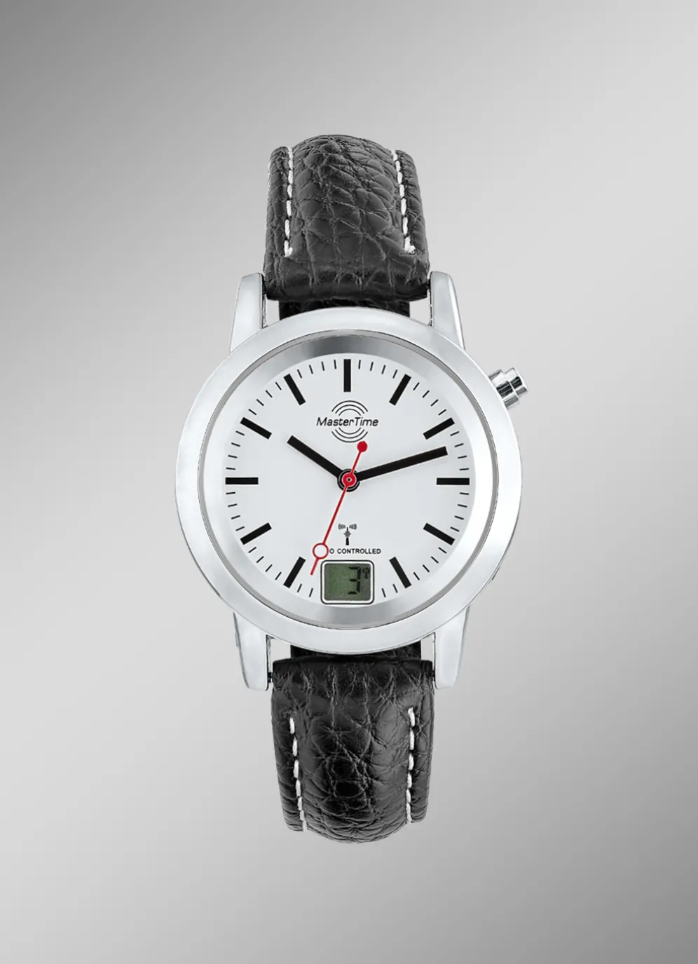 Zeitlose Funk-Partneruhr der Marke Master Time in der Ausführung Damenuhr, mit Gehäuse aus Metall sowie mit einem Uhrenband aus Leder.