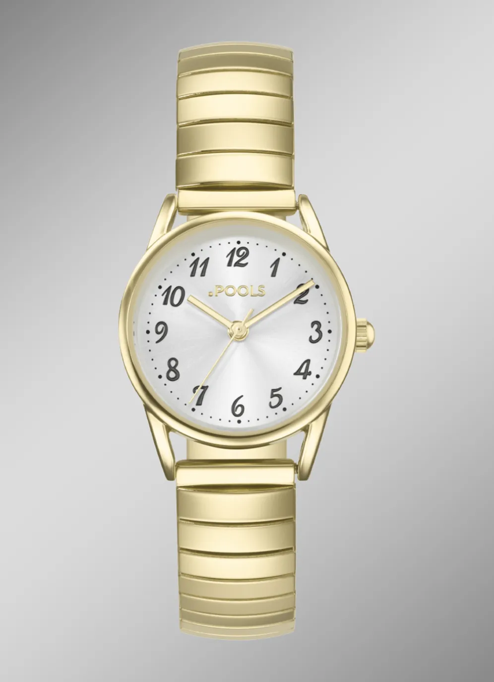 Zeitlose Eleganz trifft auf modernen Komfort: Die Quartz-Damenuhr Pools 1989 mit Zugband ist eine stilvolle Begleiterin für jeden Anlass. Ob im Büro, beim Shopping oder beim Dinner, diese Uhr passt zu jedem Outfit und jedem Stil. Das goldfarbene Metallgehäuse und das Edelstahl-Zugband verleihen der Uhr einen edlen Glanz, während das weiße Zifferblatt mit den schwarzen Zahlen für eine klare Ablesbarkeit sorgt. Die Uhr ist spritzwassergeschützt und hat einen Durchmesser von 24 mm, was sie ideal für zierliche Handgelenke macht. Das Mineralglas schützt das Zifferblatt vor Kratzern und Stößen.