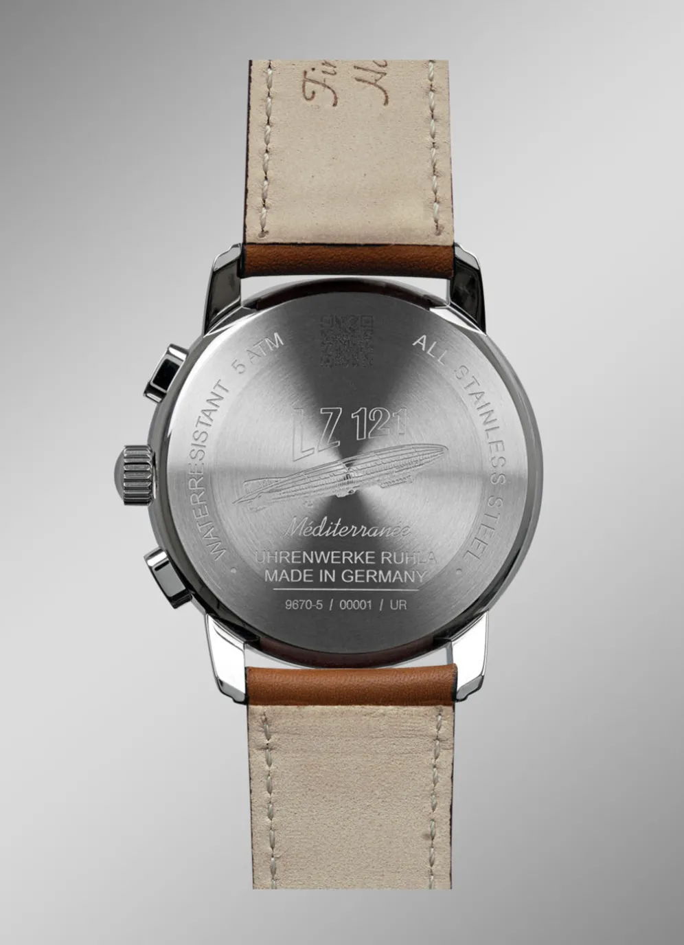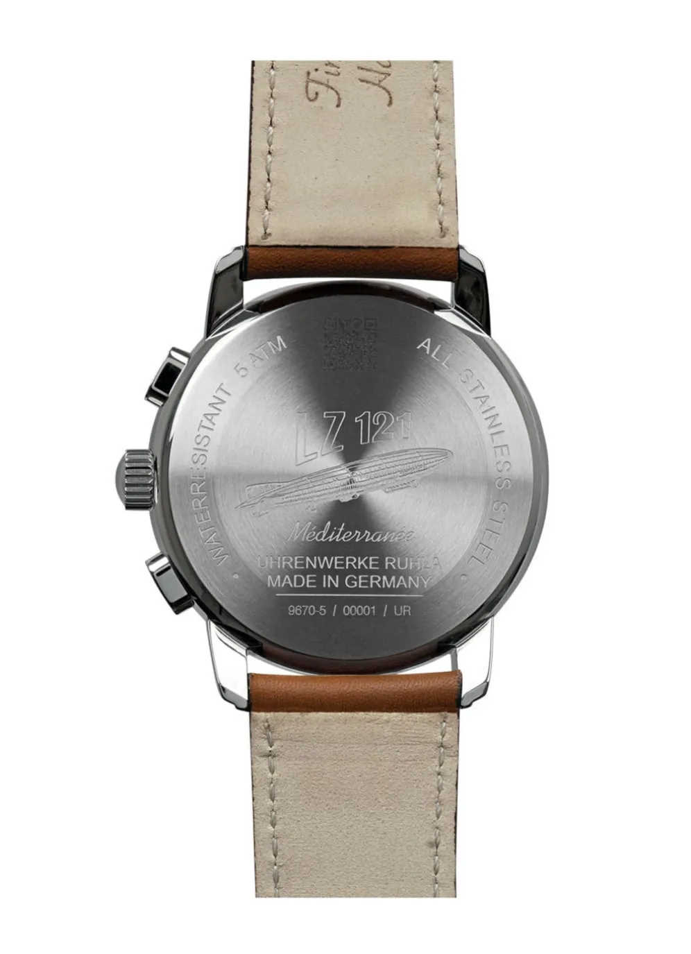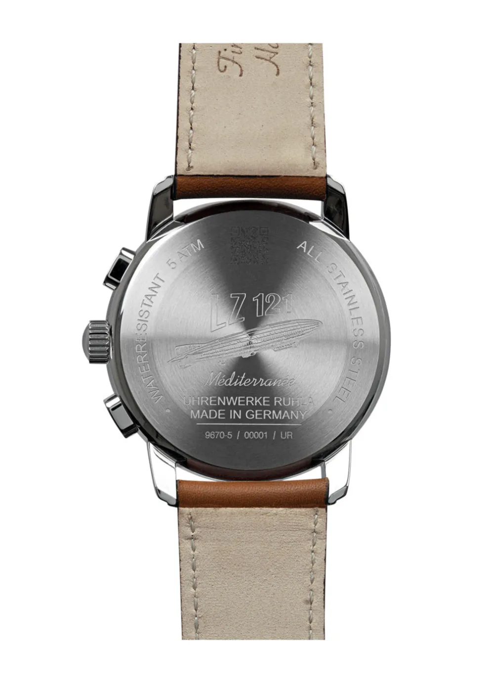 Die Zeppelin Méditerranee hat ein Edelstahlgehäuse mit einem Durchmesser von 42 mm, das jedem Handgelenk Kraft und Ausstrahlung verleiht. Das Lederband mit Dornschliesse sorgt für einen komfortablen Sitz. Das Mineralglas ist kratz- und stoßfest und garantiert eine optimale Lesbarkeit des Zifferblatts.