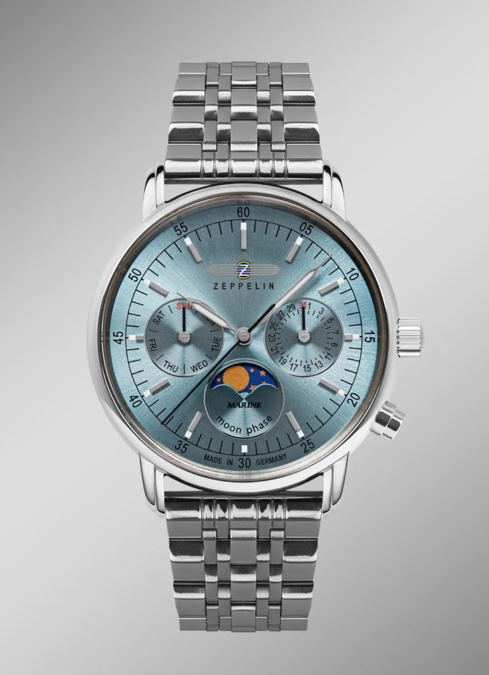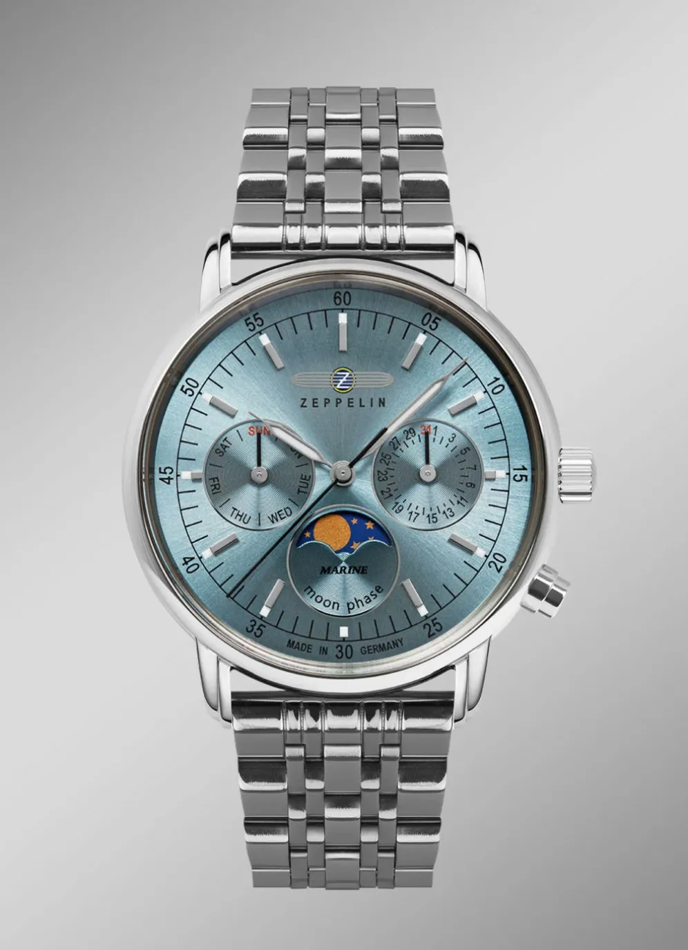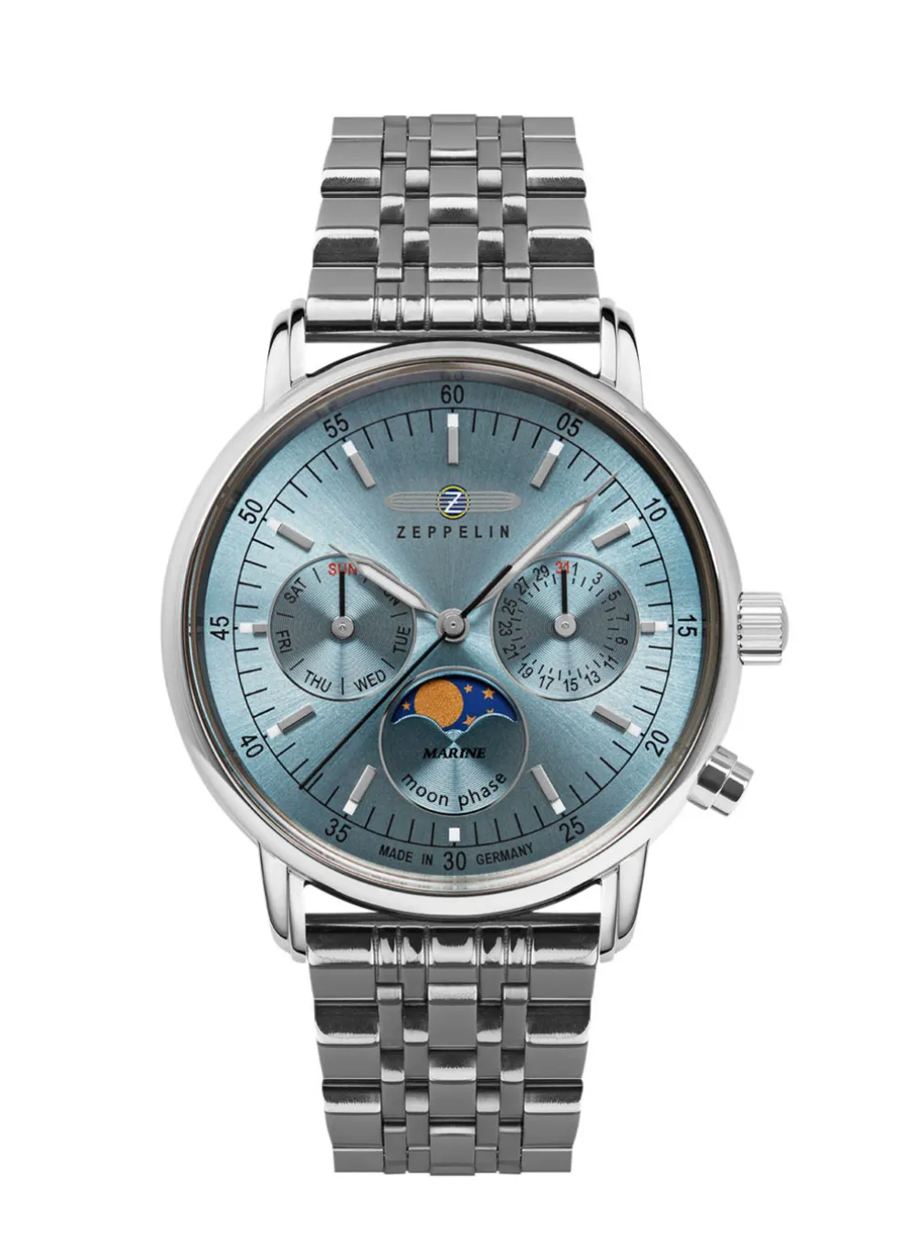 Sie lieben das Meer, die Schiffe und die Abenteuer? Dann ist die Zeppelin LZ 14 Marine die perfekte Uhr für Sie. Diese Damenuhr ist eine Hommage an die legendären Zeppeline, die einst die Welt eroberten. Mit ihrem edlen Design, ihrem hochwertigen Quarzwerk und ihrem eisblauem Zifferblatt mit Datum, Mondphase und Wochentag ist sie ein echter Hingucker an Ihrem Handgelenk.