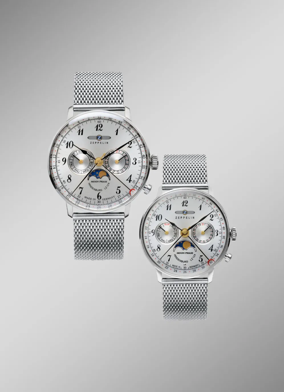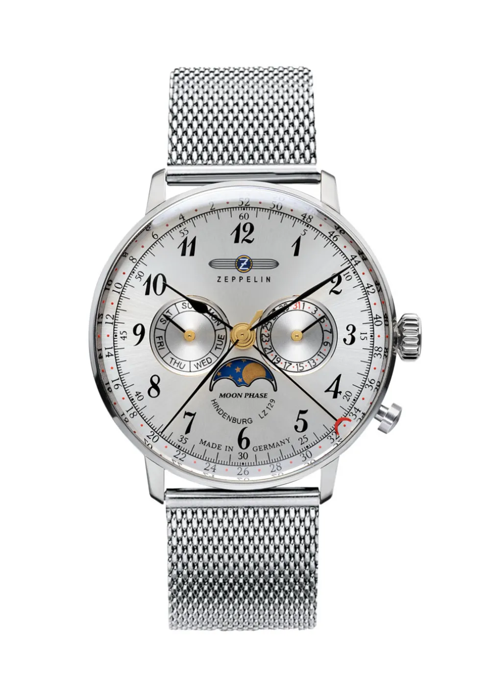 Die Zeppelin-Quartz-Herrenuhr 7036M-1 Hindenburg Mondphase macht dank ihrem Durchmesser von 40 mm auch an Damen- oder schmäleren Herren-Handgelenken eine ausgezeichnete Figur, nicht zuletzt durch das feine Milanaise-Armband.