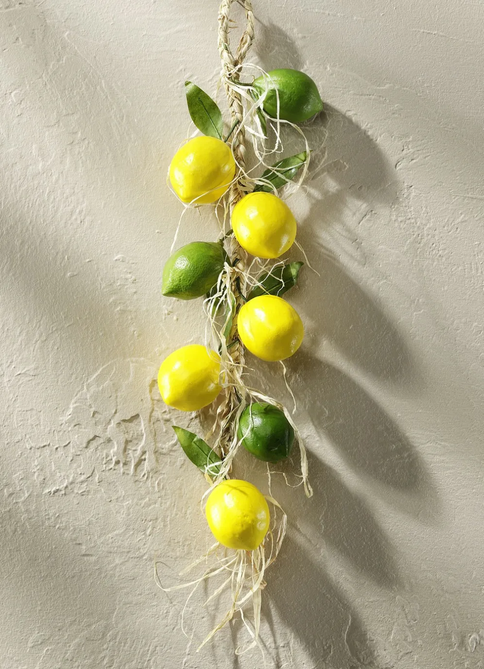 Ein tolles Dekorationsobjekt für Ihr Zuhause ist dieser prachtvolle Zitronen-/Limettenzopf zum Hängen. Faszinierend echt aussehend ist er aus Kunstmaterial und Bast hergestellt.
