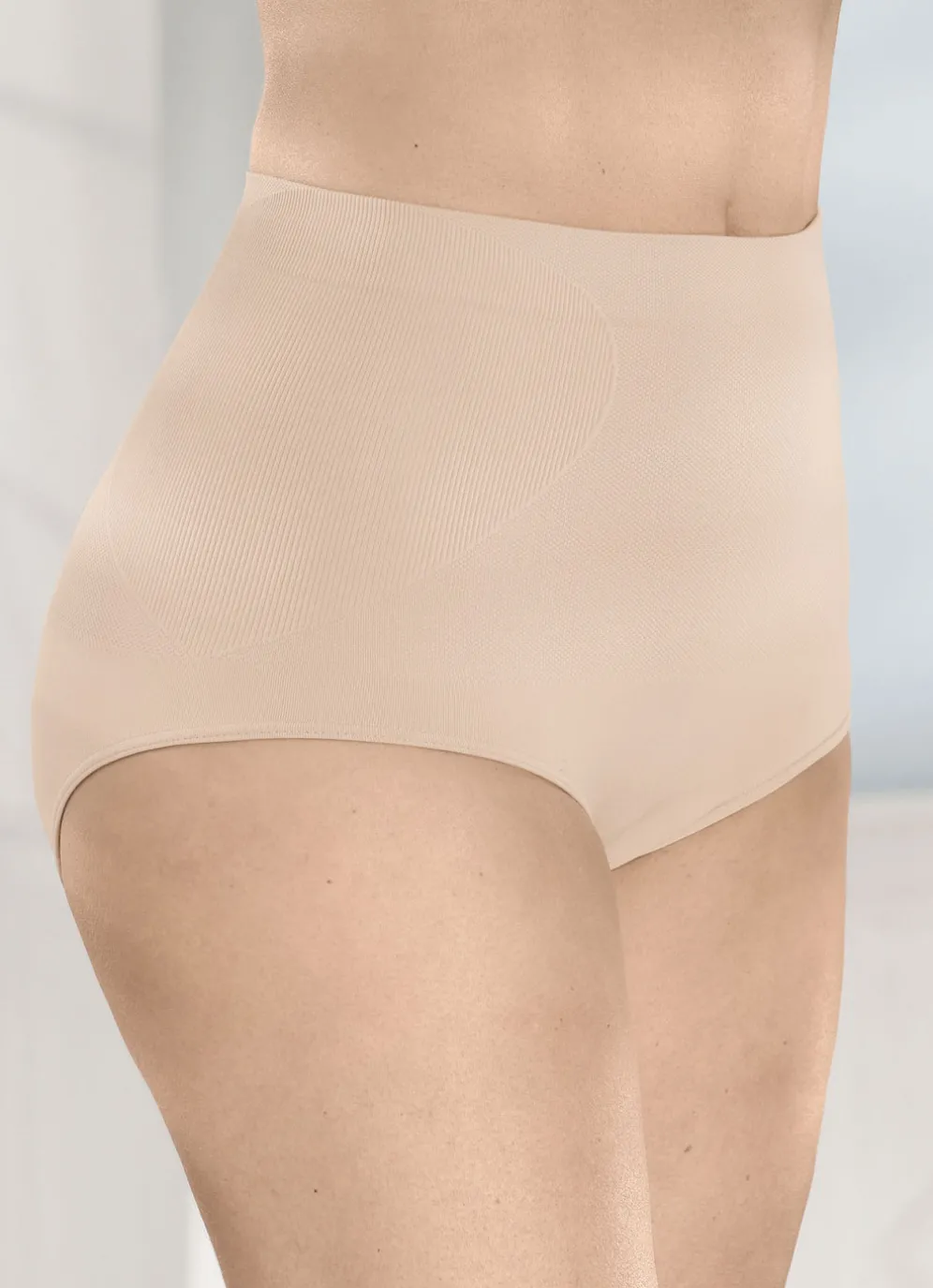 Beigefarbener Formslip mit eingestrickten Formzonen für eine schöne Silhouette. Ohne Seitennähte.