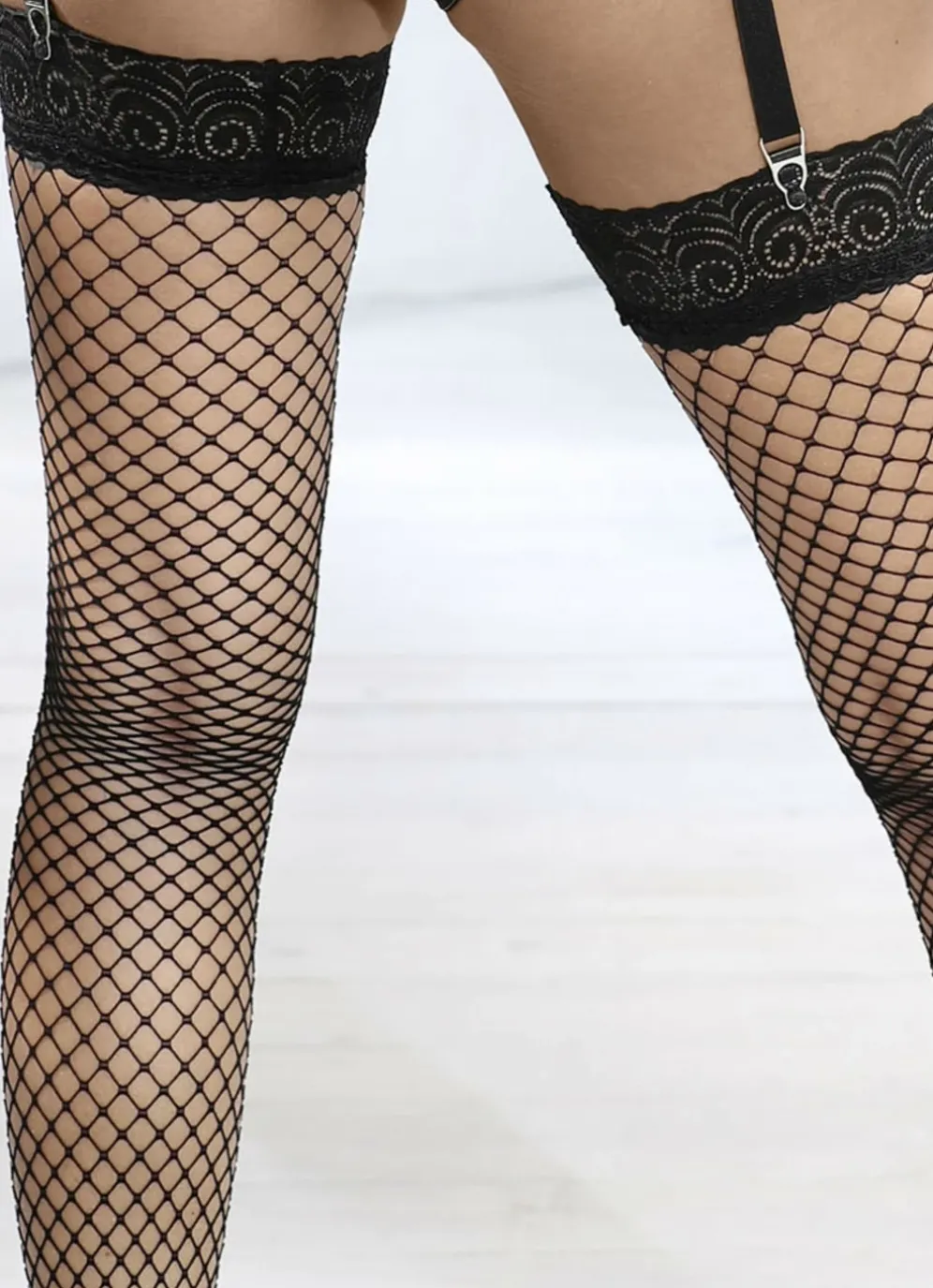 Halterlose Netzstrümpfe in Schwarz, mit Haftband am Spitzenabschluss.