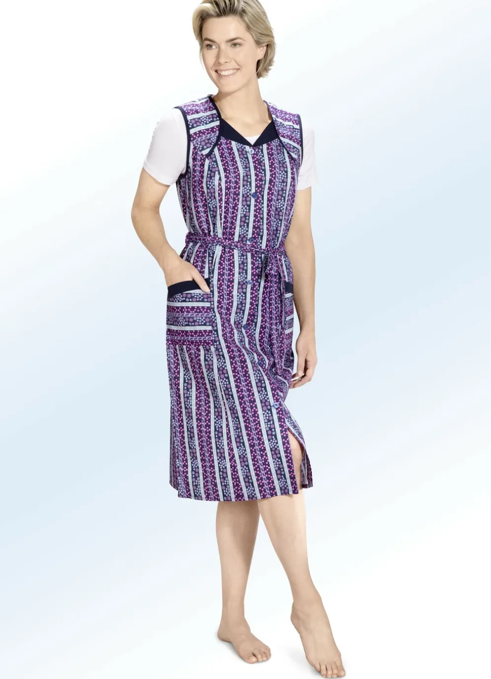 Bezaubernde, wadenlange, ärmellose Kittelschürze, die wir Ihnen im preiswerten Zweierpack anbieten! Mit V-Ausschnitt, durchgehender Knopfleiste, marinefarbenen Einsätzen am Halsausschnitt und an den zwei aufgesetzten Taschen.