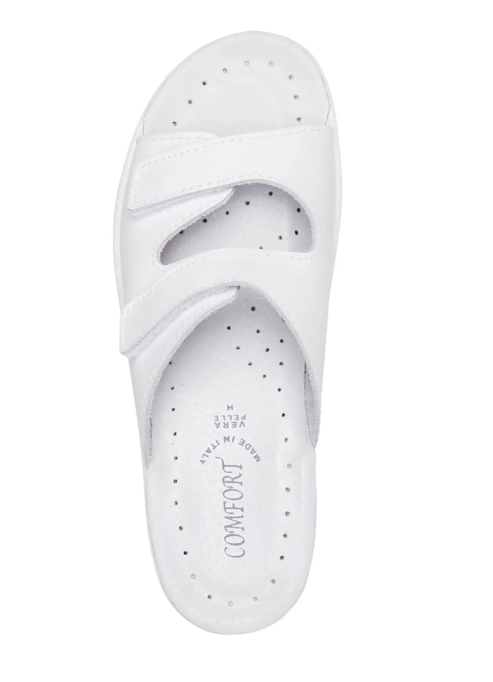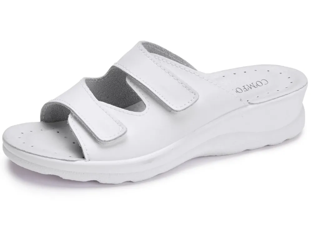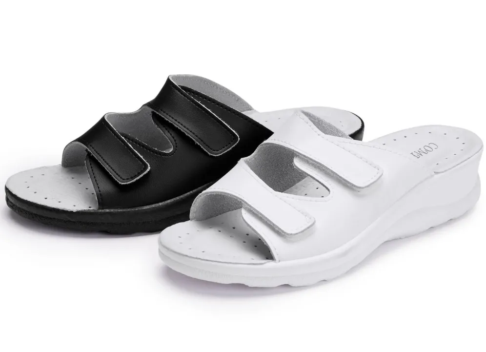 Pantoletten aus Nappaleder: in Weite H, zwei verstellbare Klettspangen, gepolstertes Lederfußbett, PU-Laufsohle sowie 30 mm Keilabsatz