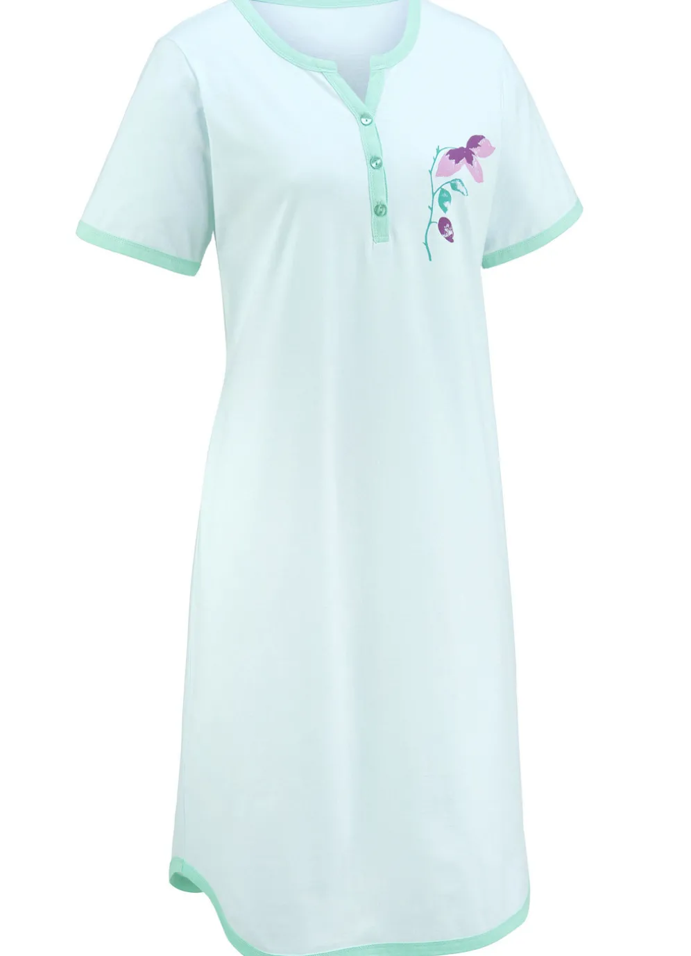 Zweierpack Nachthemden, Knielang mit Knopfleiste und kurzen Ärmeln in 1X Aqua, 1X Aqua-Pflaume und in Größe 38.