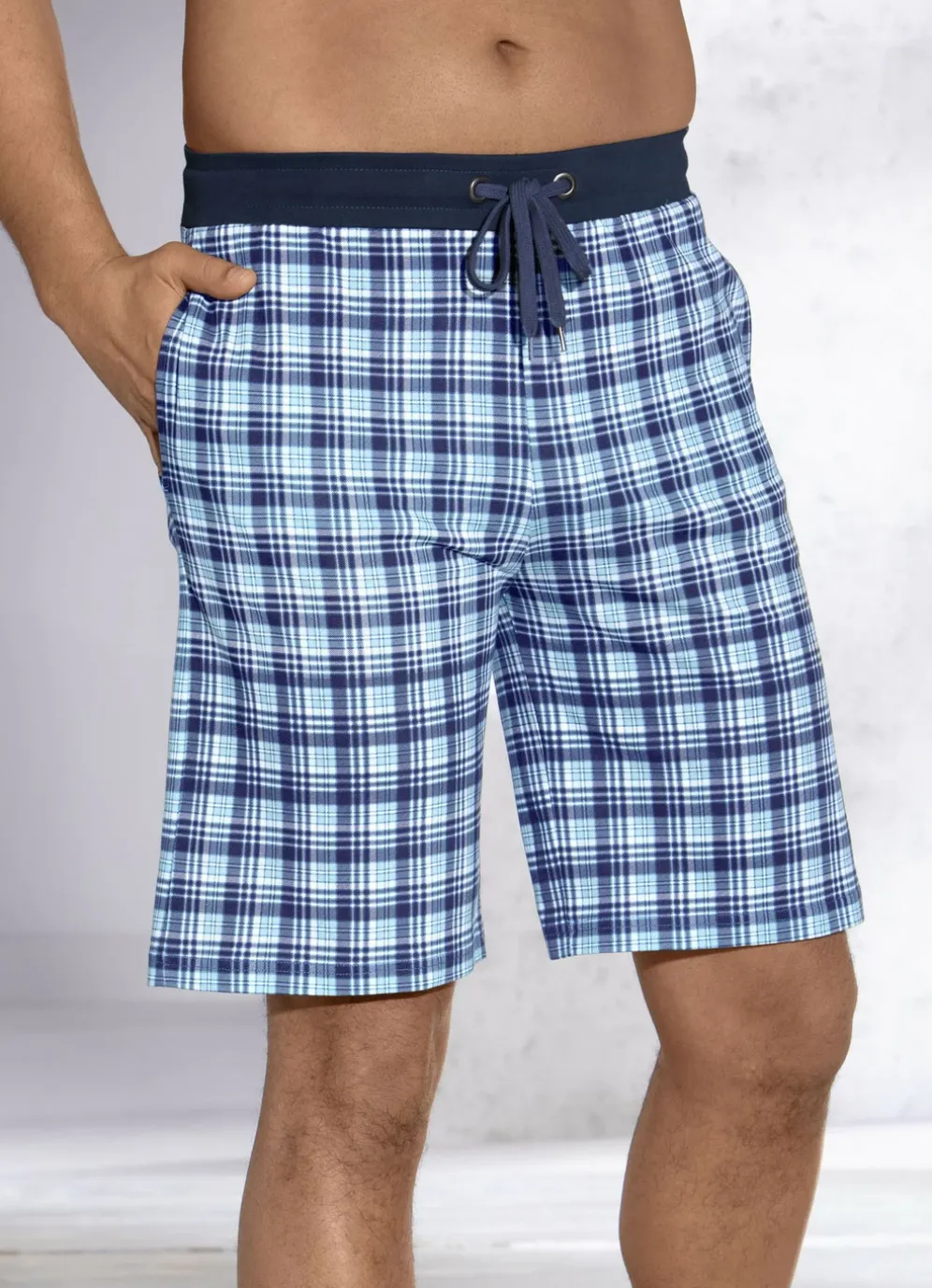 Zweierpack Schlaf- und Freizeithosen mit Durchzugband und Seitentaschen in 1X Marine Kariert, 1X Marine und in Größe 46.
