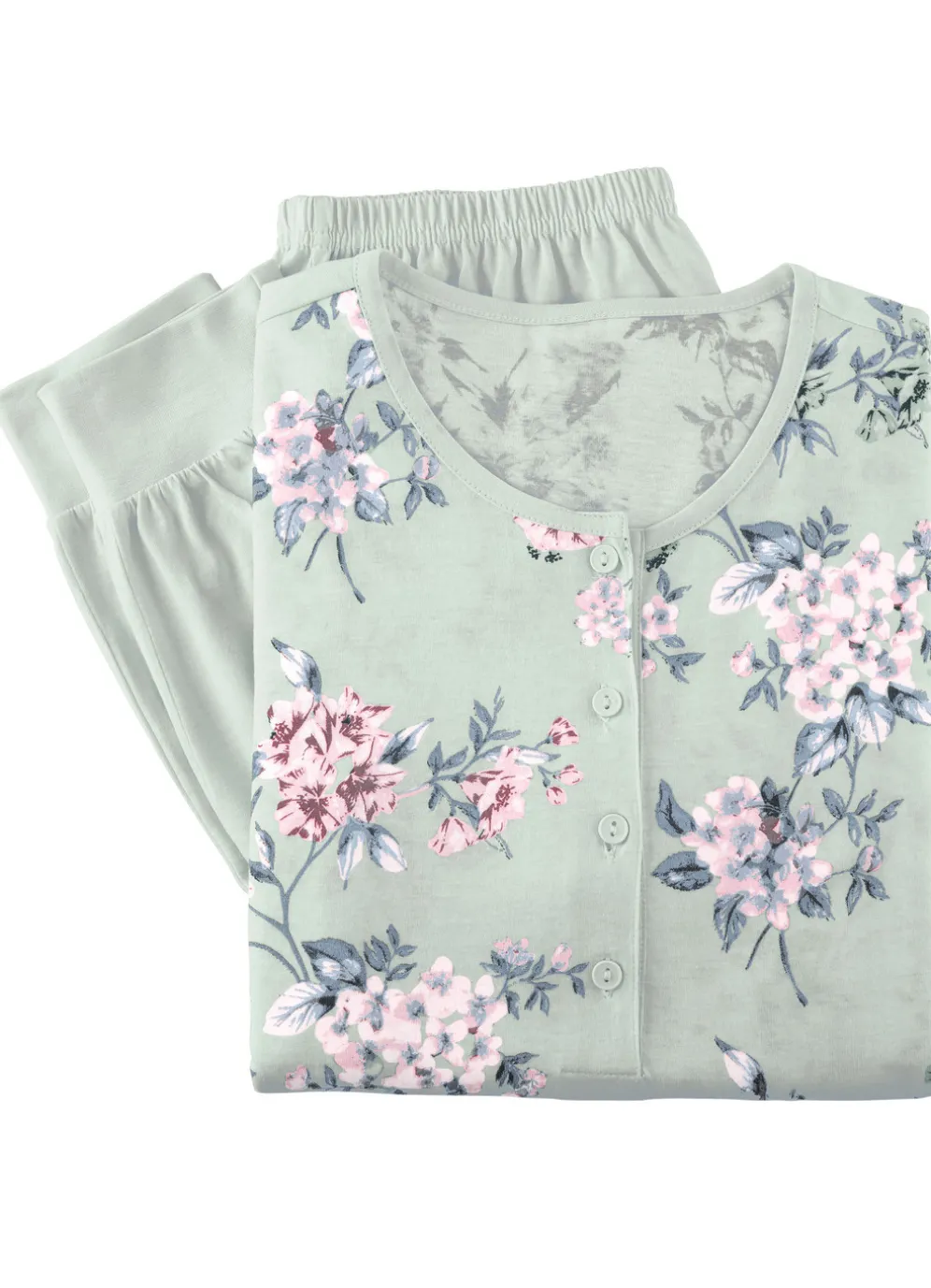 Zweierpack Schlafanzüge, Langarm und Knopfleiste in 1X Salbei-Bunt, 1X Rosé-Bunt und in Größe 38.