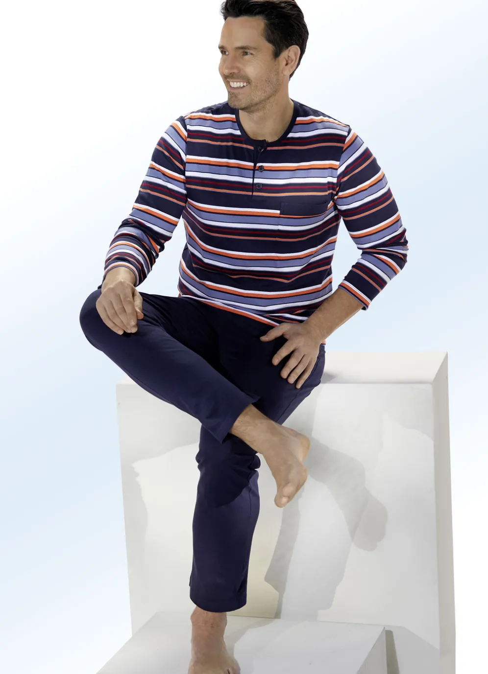 Vorteilhafter Zweierpack Schlafanzüge in tollen Farben! Oberteile mit garngefärbtem Ringeldessin, Knopfleiste, aufgesetzter Brusttasche sowie innerem Rückensattel. Lange Hosen mit auswechselbarem