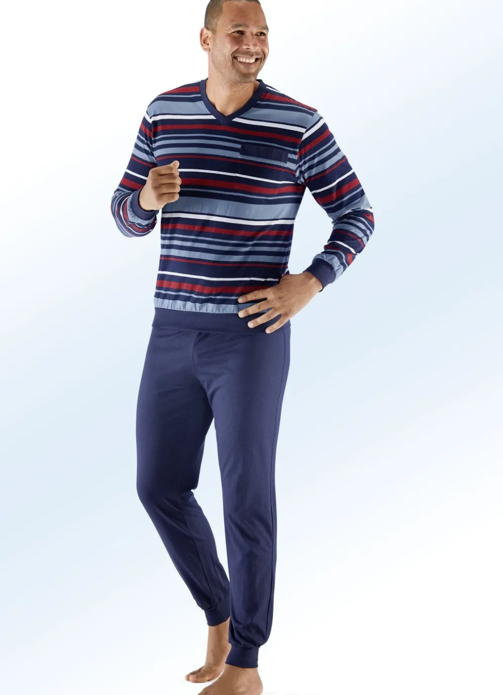 Vorteilhafter Zweierpack Schlafanzüge mit Bündchenabschlüssen. Oberteil: garngefärbtes Ringeldessin,