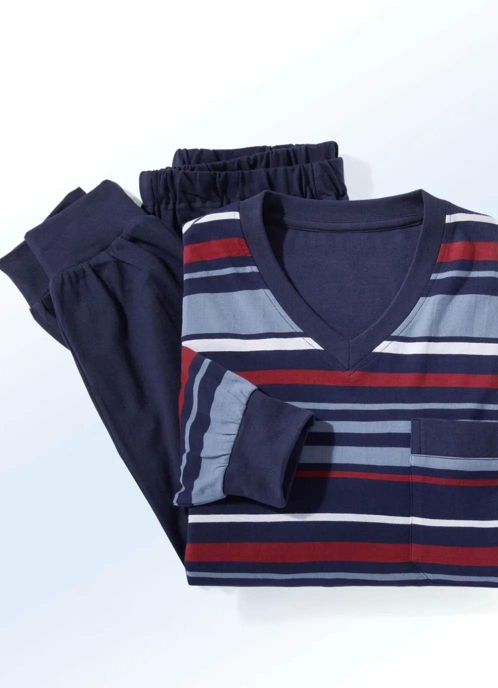 Zweierpack Schlafanzüge mit V-Ausschnitt und Bündchenabschlüssen in 1X Gruen-Blau, 1X Rot-Navy und in Größe 46.