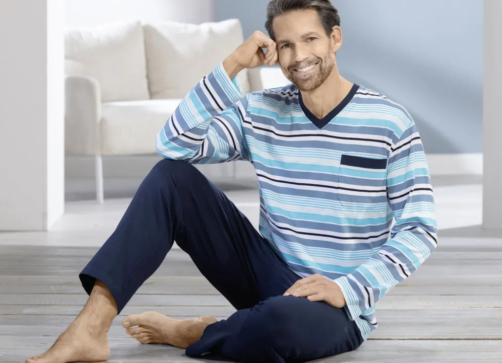 Zweierpack Schlafanzüge mit V-Ausschnitt und offenen Abschlüssen in 1X Blau-Bordeaux-Marine, 1X Rauchblau-Türkis-Navy und in Größe 46.